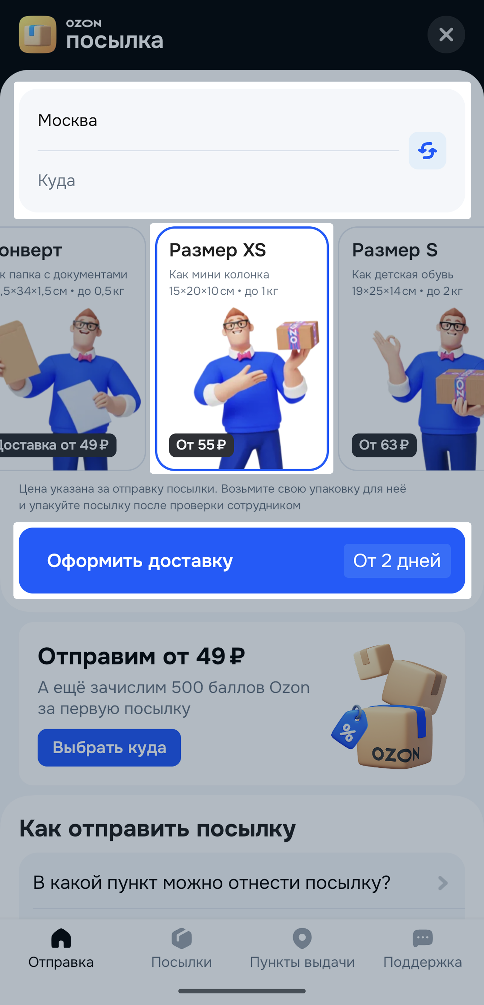 Укажите, откуда и куда отправляется посылка, выберите её размер и нажите Оформить доставку.