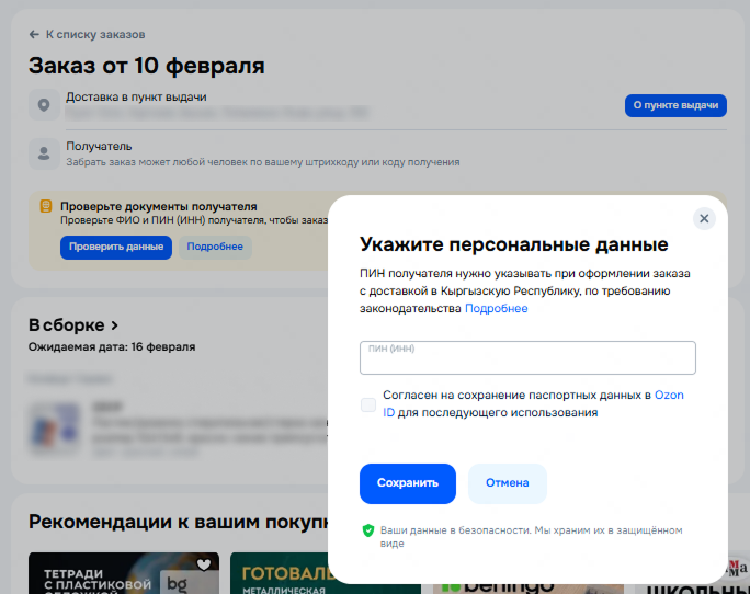 Если вы хотите, чтобы персональные данные использовались для следующих заказов, укажите, что вы согласны на сохранение и обработку ваших данных Ozon.