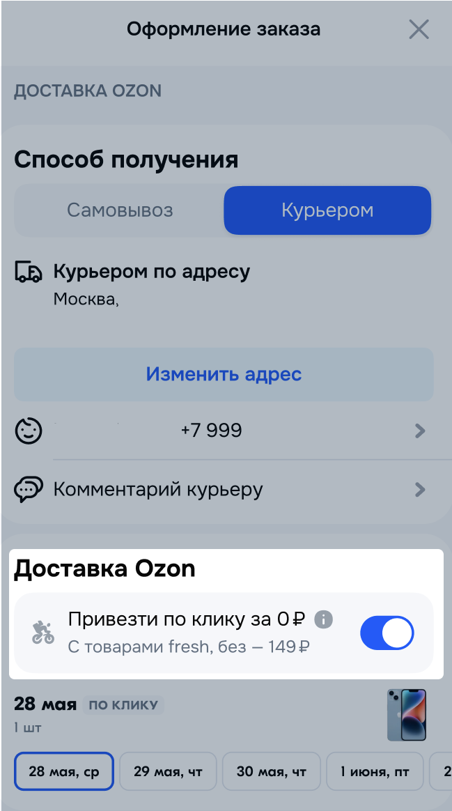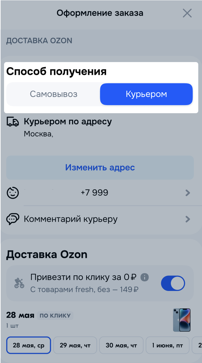 Товары категории Ozon fresh доставляются отдельно от остальных заказов. Их могут доставить: