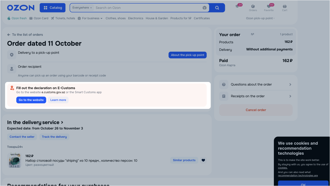 - If you placed an order in Georgia or Azerbaijan: wait for a call or message from the carrier or customs representative.