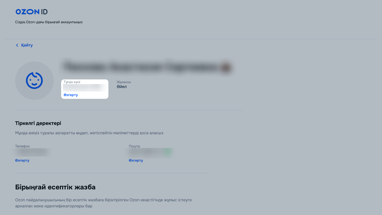 - Ozon ID парақшасында туған күні жанындағы Добавить или Изменить («Қосу») немесе («Өзгерту») батырмасын басыңыз.
