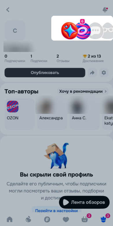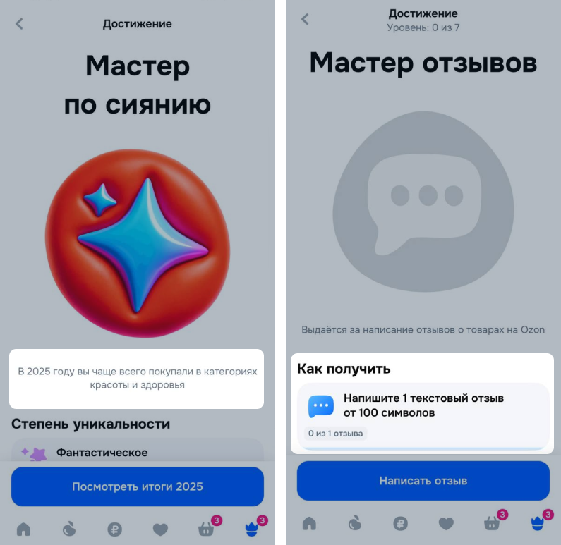 За активность на Ozon можно получить достижение — символическую награду в виде значка, которая отображается в вашем профиле.