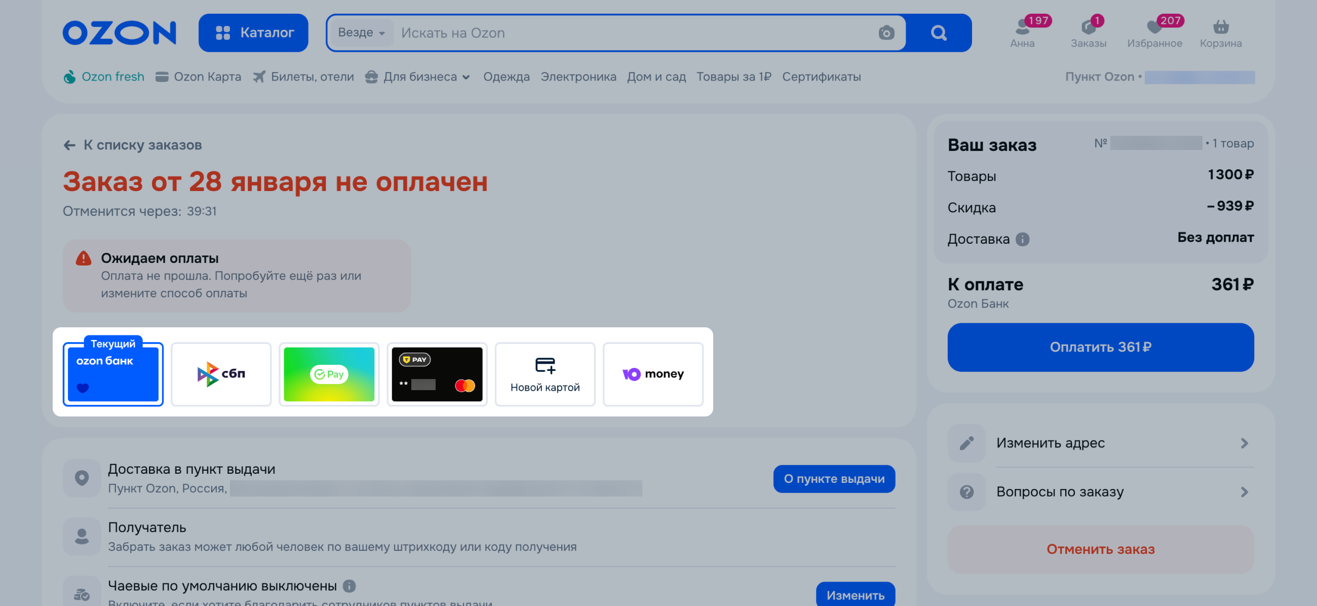 - выбран способ оплаты со счёта в Ozon Банке.