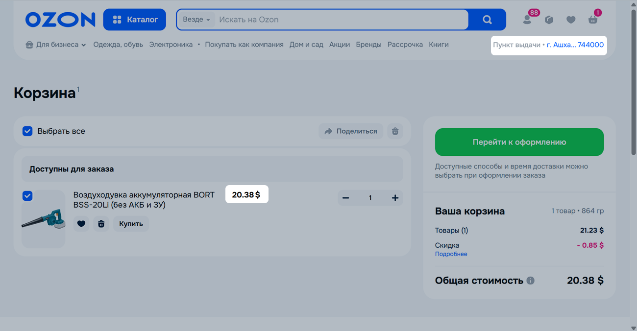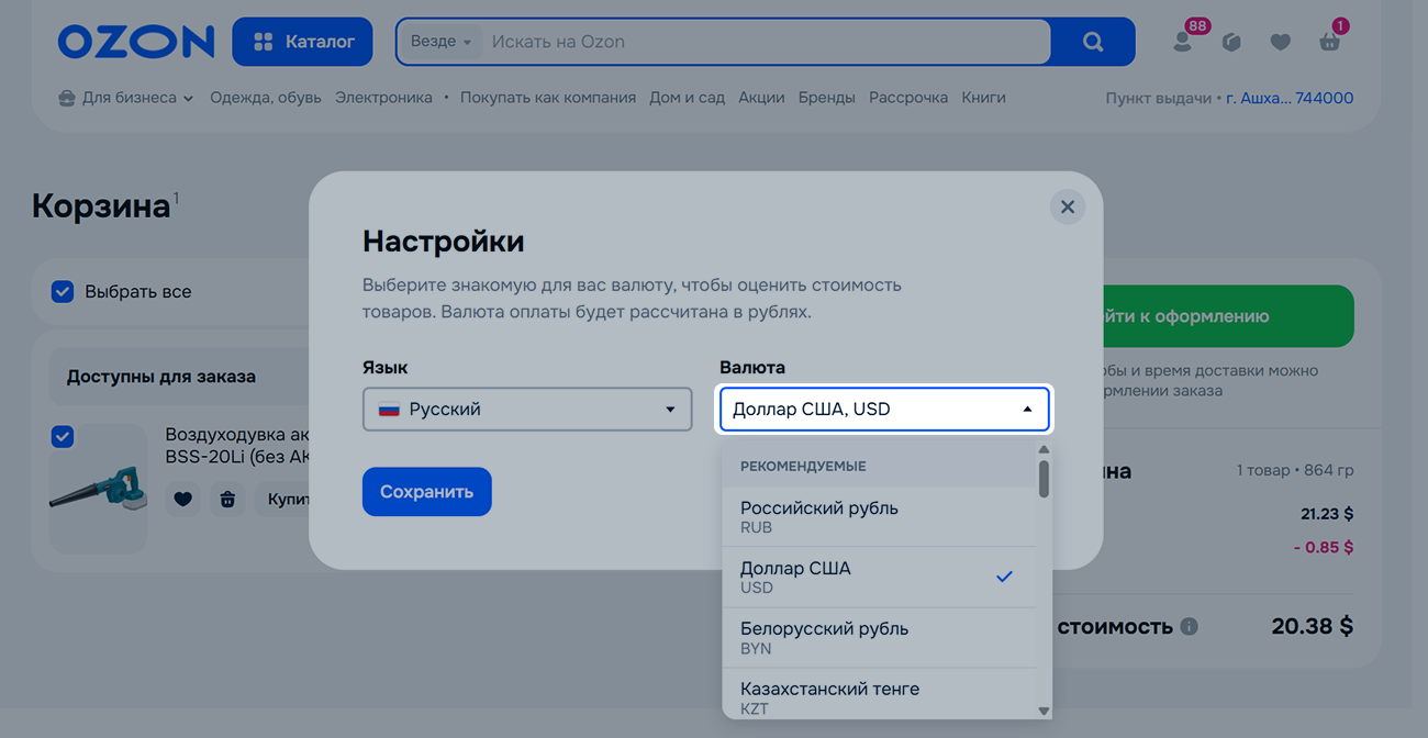 Стоимость заказа отображается в валюте в зависимости от выбранного адреса доставки и может быть изменена на валюту другой страны.