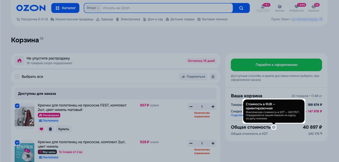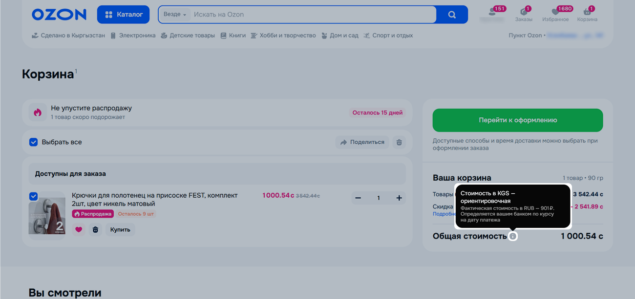 рядом с Общая стоимость в корзине или Итого на странице оформления заказа.