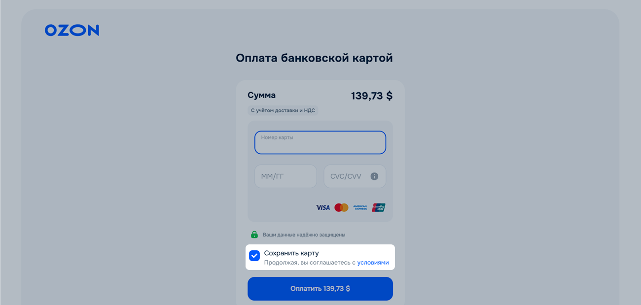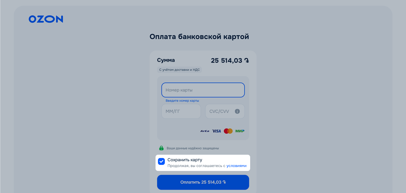 - Если вы оплачиваете новой картой, введите данные карты. Чтобы сохранить карту для оплаты следующих заказов, отметьте Сохранить карту.