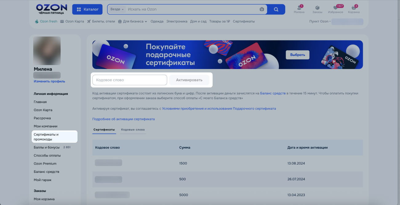 На Ozon вы можете дарить и получать сертификаты на определённую сумму, а потом оплачивать ими покупки — оплата таким способом доступна только физическим лицам.