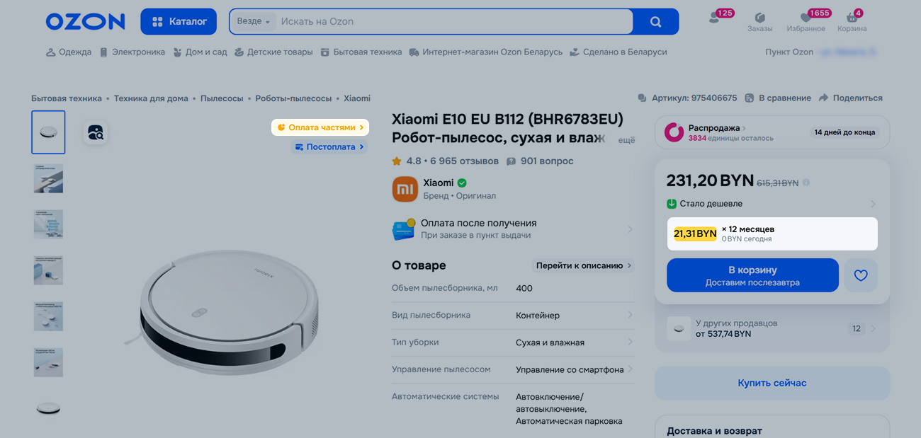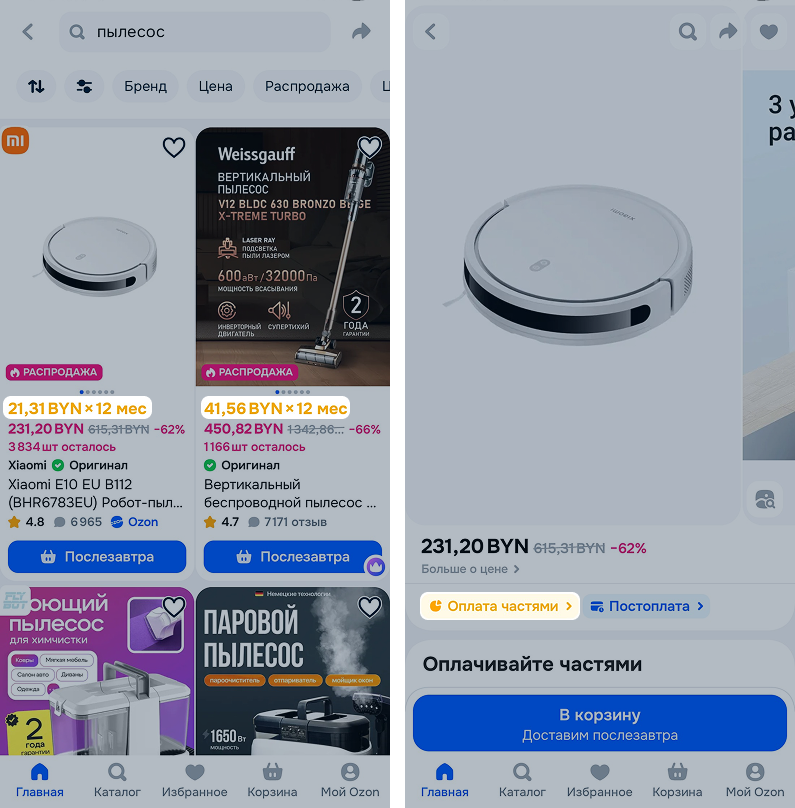 Оплата частями — кредит от банка-партнёра по ставке от 0,0001%. Частями можно оплатить товары на ozon.by из корзины Ozon Беларусь общей суммой от 190 до 20 000 белорусских рублей.