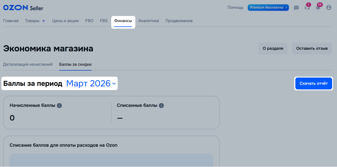 Если баллов окажется больше, чем расходов, Ozon перечислит вам остаток в валюте договора, отобразит выплату как премию и выставит по ней акт. По акту о премии НДС платить не нужно. Отобразим сумму премии в разделе Финансы → Баллы за скидки в блоке Премия.