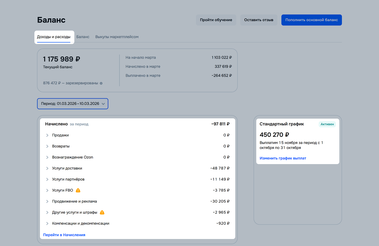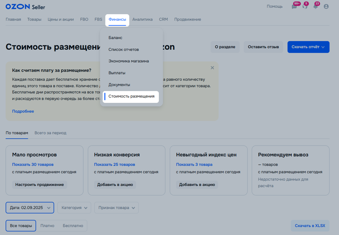 В разделе Финансы → Стоимость размещения показываем количество ваших товаров на складах Ozon и стоимость их размещения.