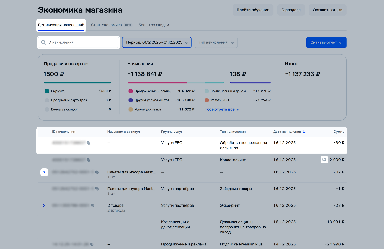 Чтобы найти конкретное начисление, введите в строке поиска полное значение его идентификатора. Например, номер отправления, идентификатор грузоместа или период подписки. Поиск работает по точному совпадению и не привязан к выбранным фильтрам.