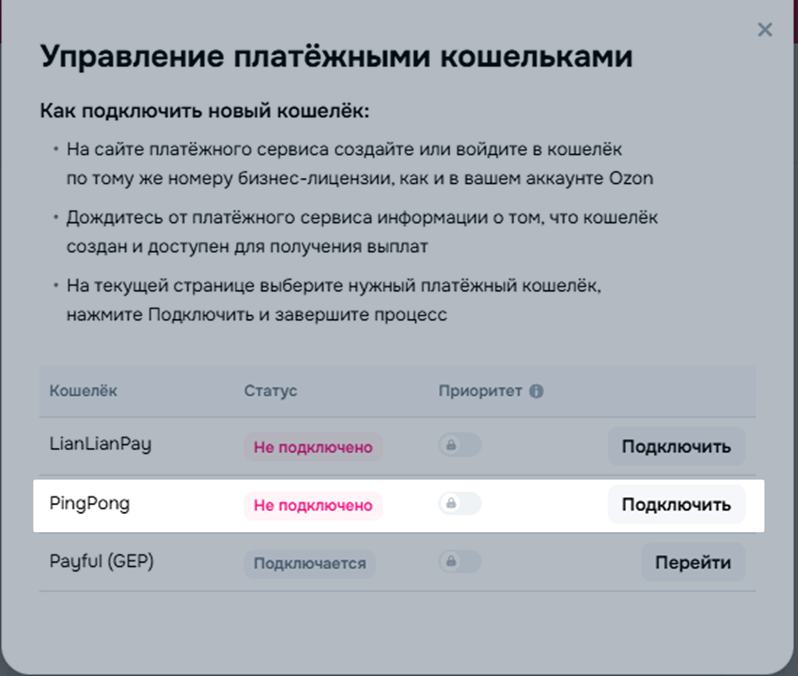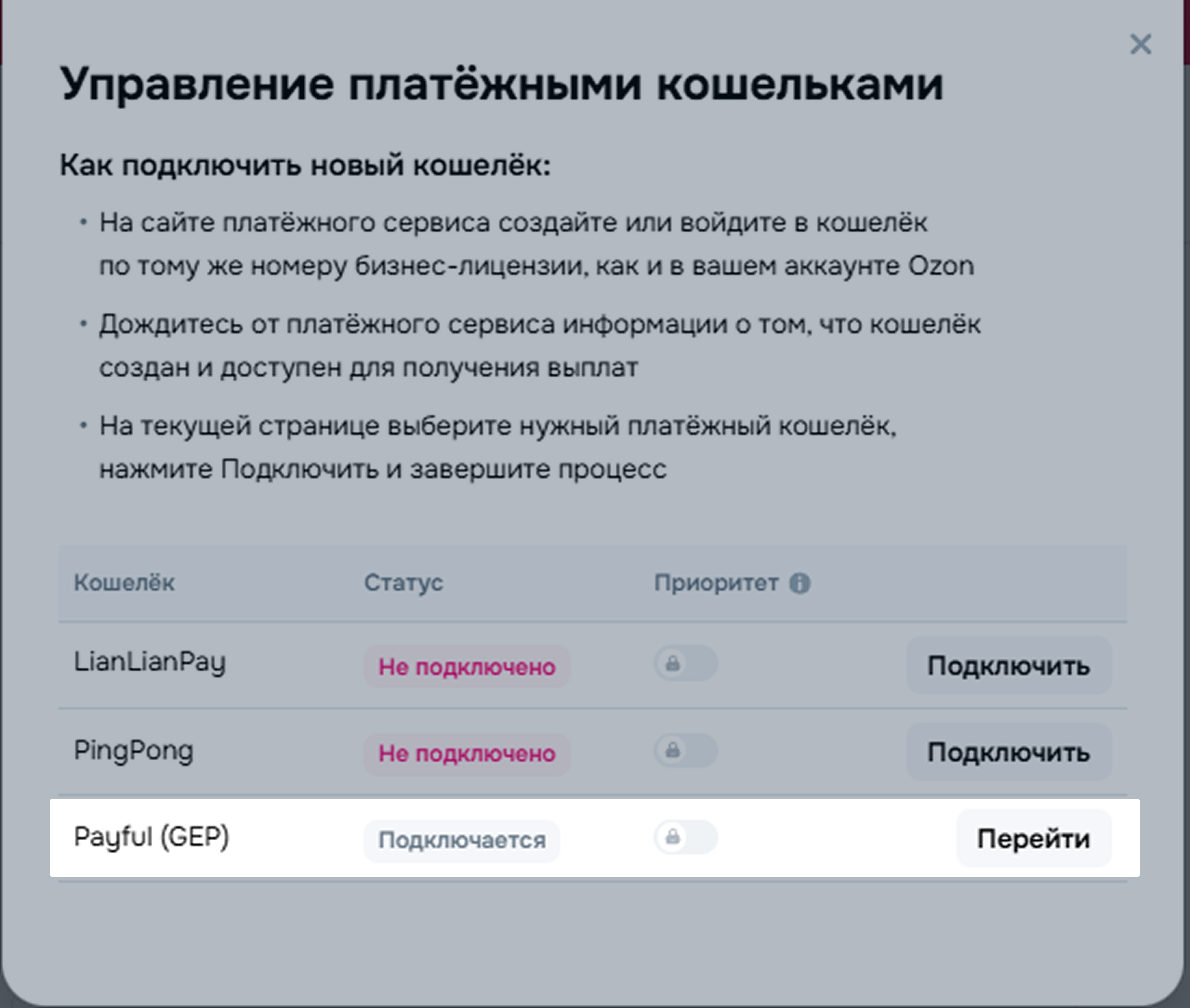Переключение недоступно для кошелька Payful (GEP).