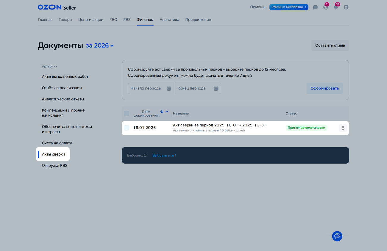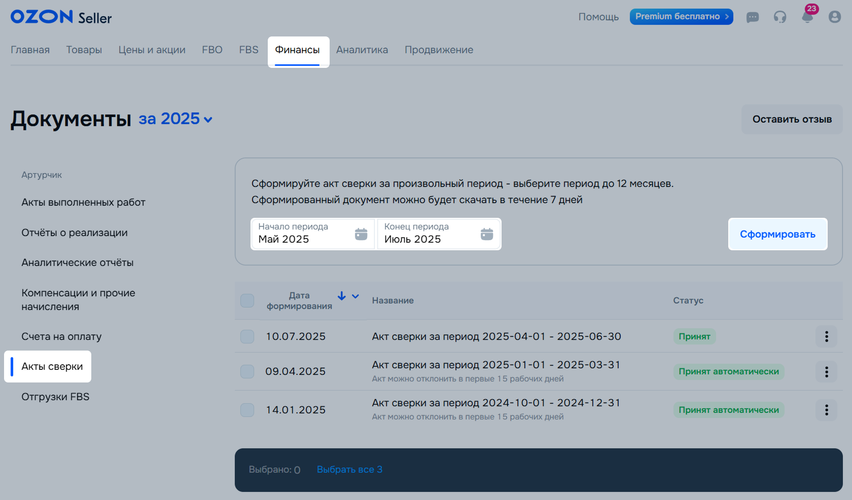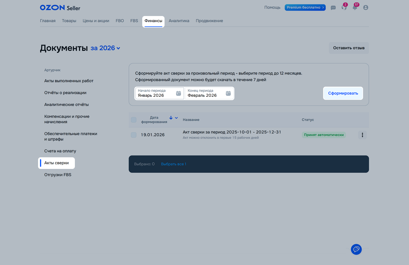 В конце каждого квартала Ozon формирует акт сверки взаимных расчётов. Мы отправим его вам до 15 числа следующего месяца. Например, акт сверки за январь–март вы получите до 15 апреля.