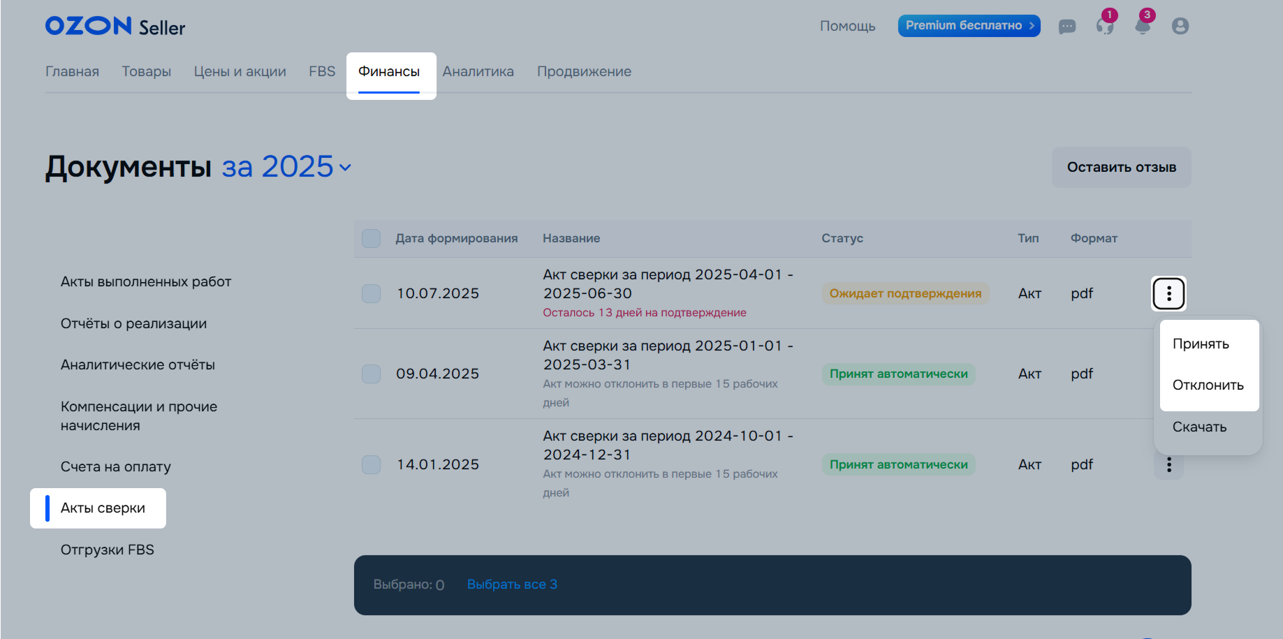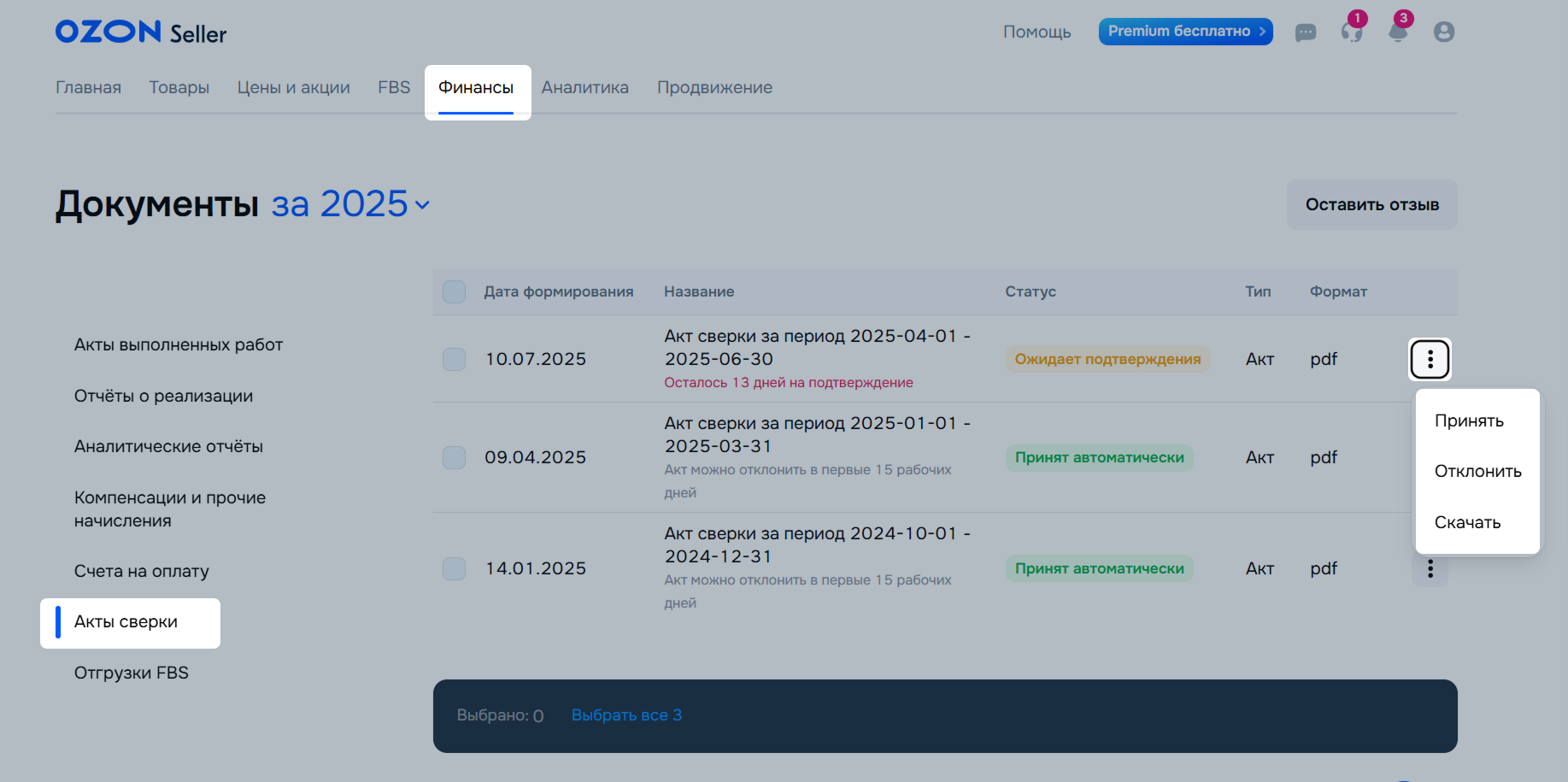 Ozon формирует акт сверки за период и отправляет его в раздел Финансы → Документы → Акты сверки. Здесь вы можете скачать, принять или отклонить документ, если не согласны с его содержанием.