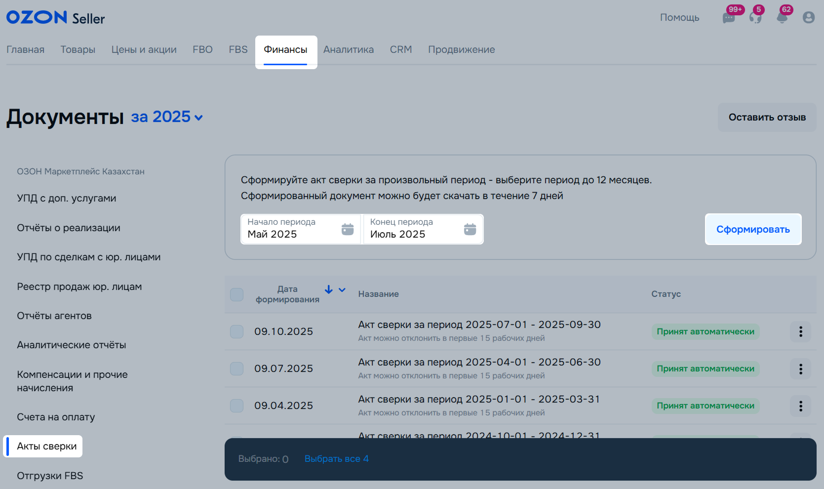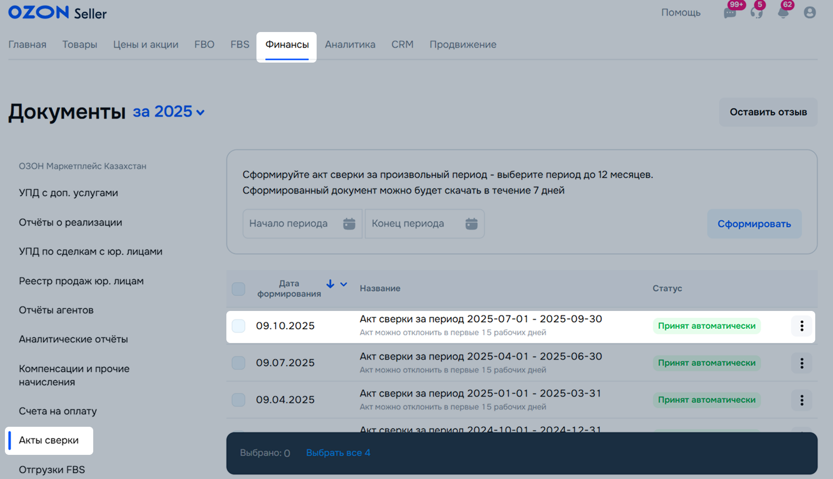 Акт сверки взаимных расчётов — документ, в котором Ozon собирает информацию обо всех взаимных расчётах с вами за период. С его помощью можно избежать расхождений в учёте финансов.