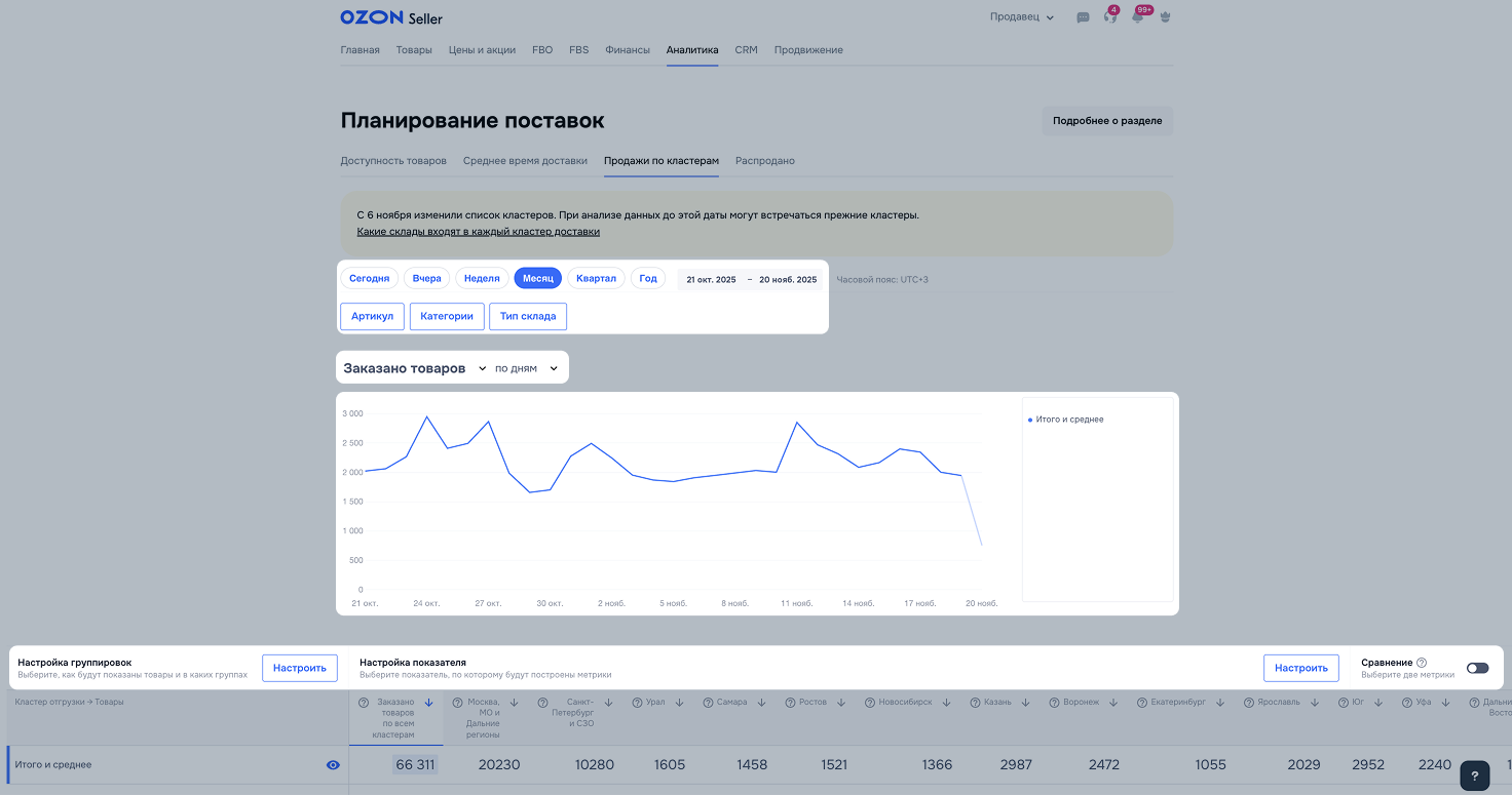 Продажи по кластерам можно посмотреть в разделе Аналитика → Продажи по кластерам. Данные обновляются раз в день.