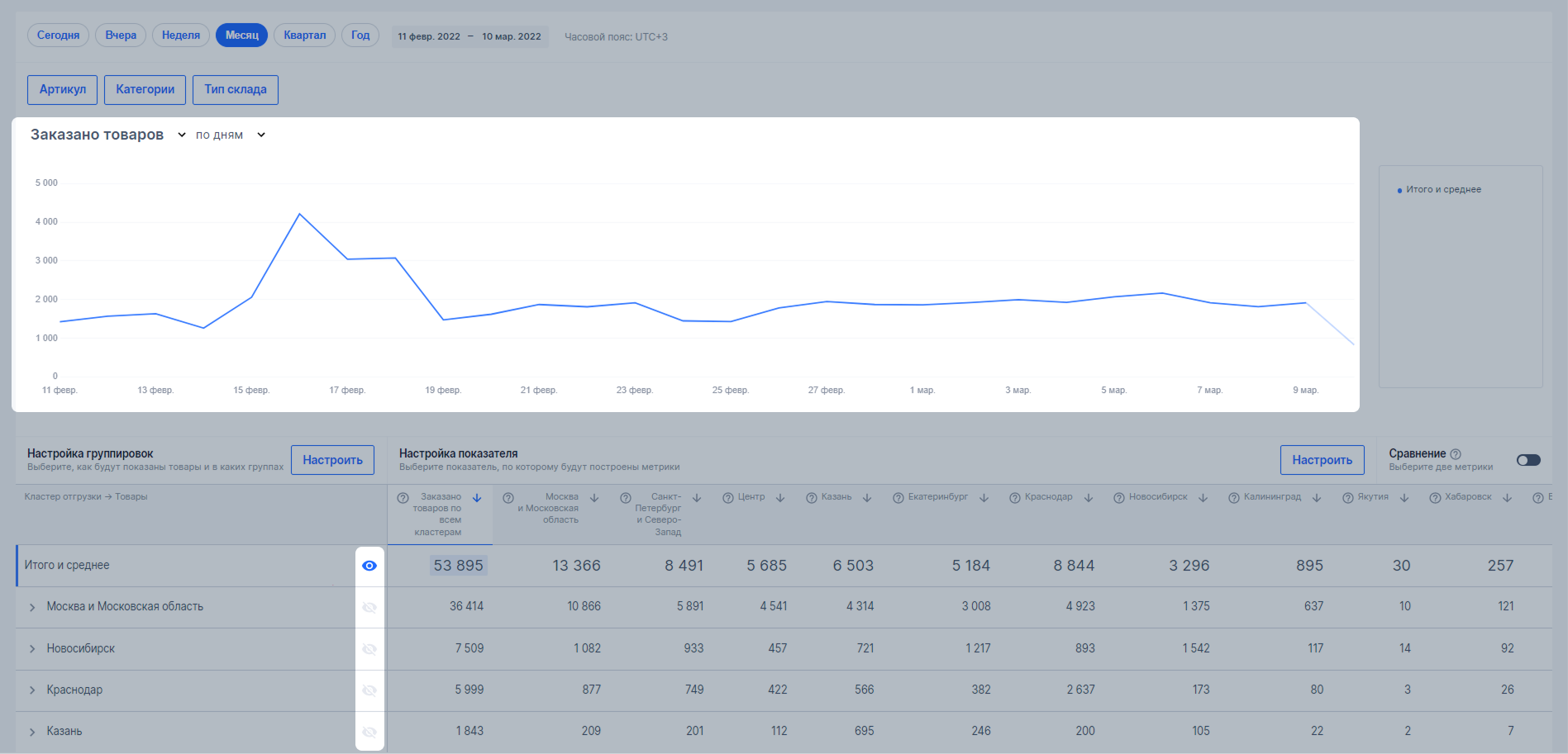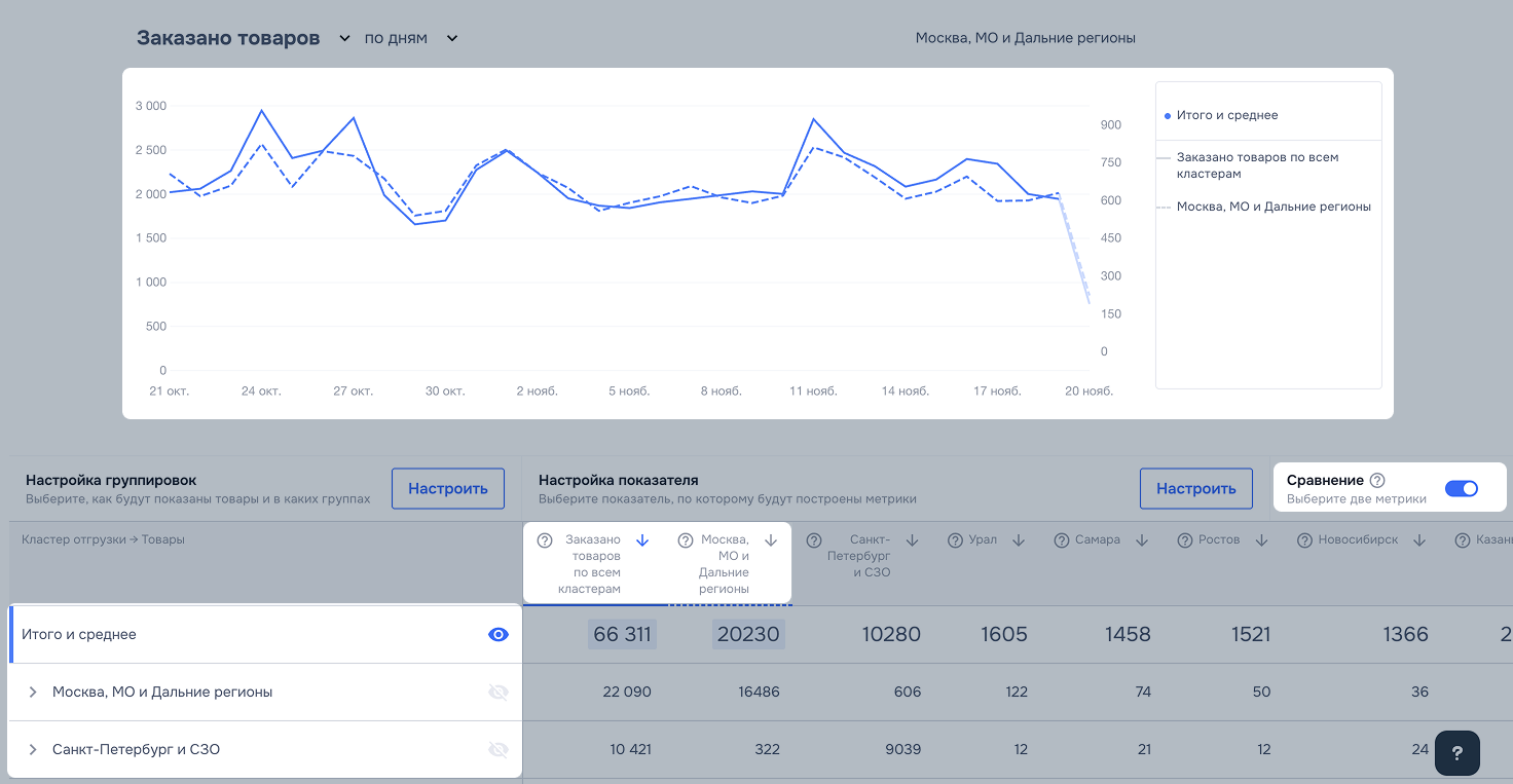С помощью графика можно понять, в каком из кластеров ваши товары продаются лучше всего. Инструмент состоит из нескольких блоков: