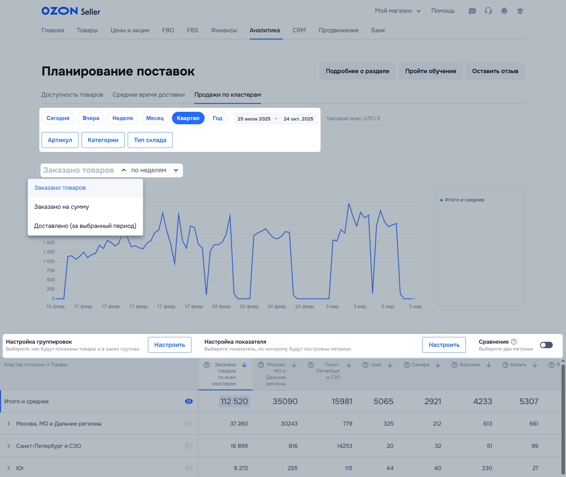 Кластеры — это зоны доставки ваших товаров по складам Ozon. В одну зону могут входить сразу несколько субъектов страны, поэтому кластеры не всегда совпадают с регионами. Подробнее о кластерах