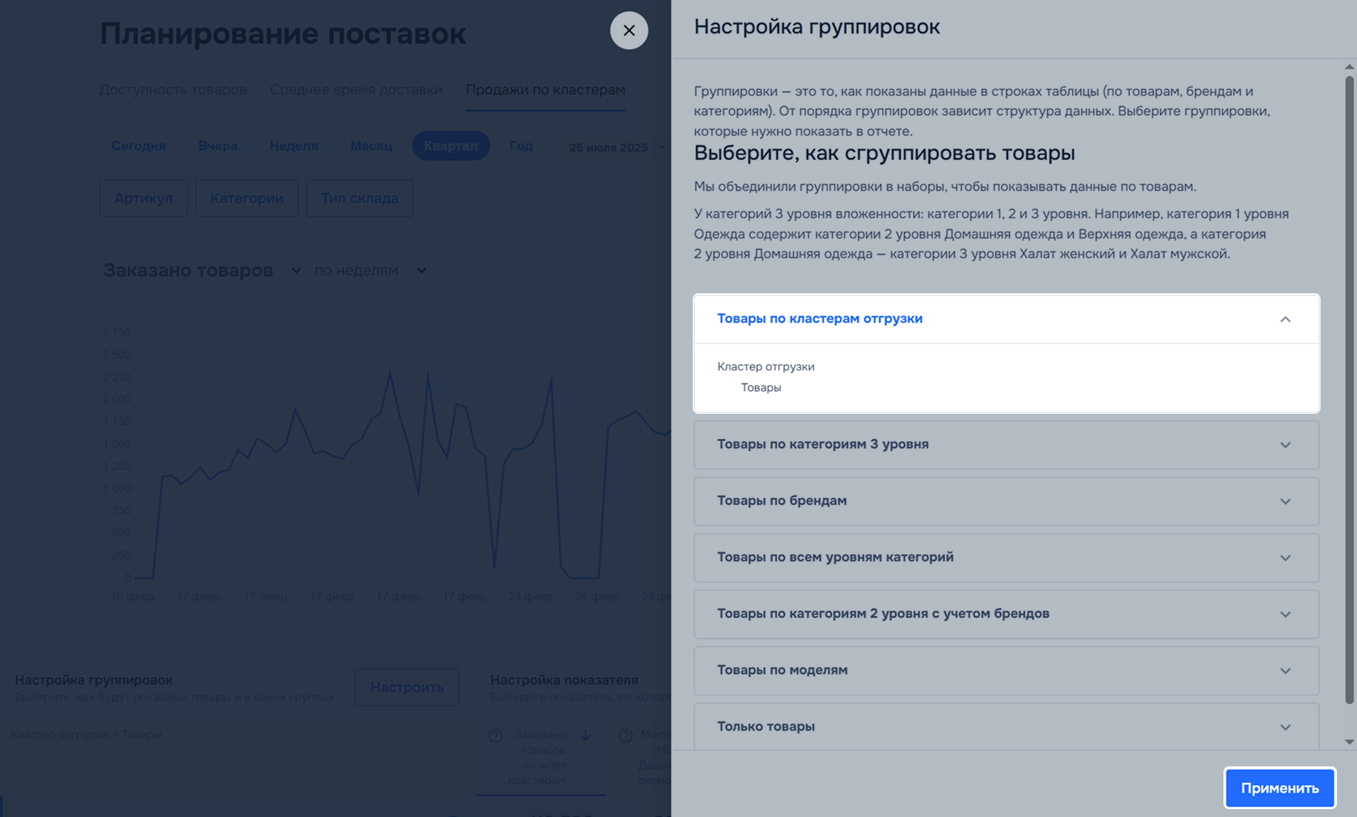 Настройка группировок. Можно выбрать, каким образом товары будут отображаться на графике: по категориям, брендам, моделям или кластерам отгрузки. Как настроить группировки