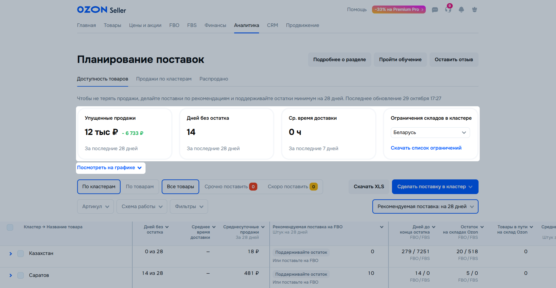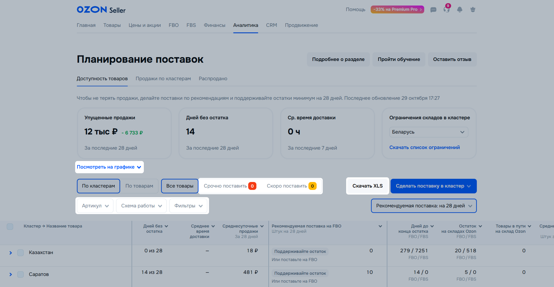 Чтобы не упускать продажи, следите за наличием товара в кластерах и вовремя планируйте поставки.