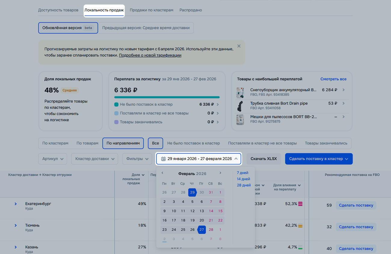 Чтобы посмотреть детализацию по товарам и кластерам, в разделе Локальность продаж выберите период в пределах последних 90 дней. Максимальный период — 30 дней. Покажем переплату за логистику в этом периоде и долю влияния каждого кластера и товара на показатель.