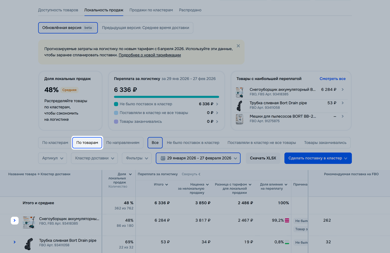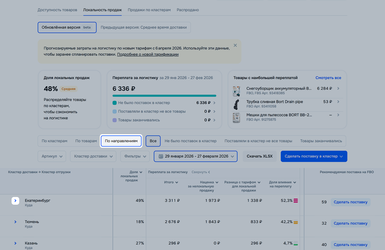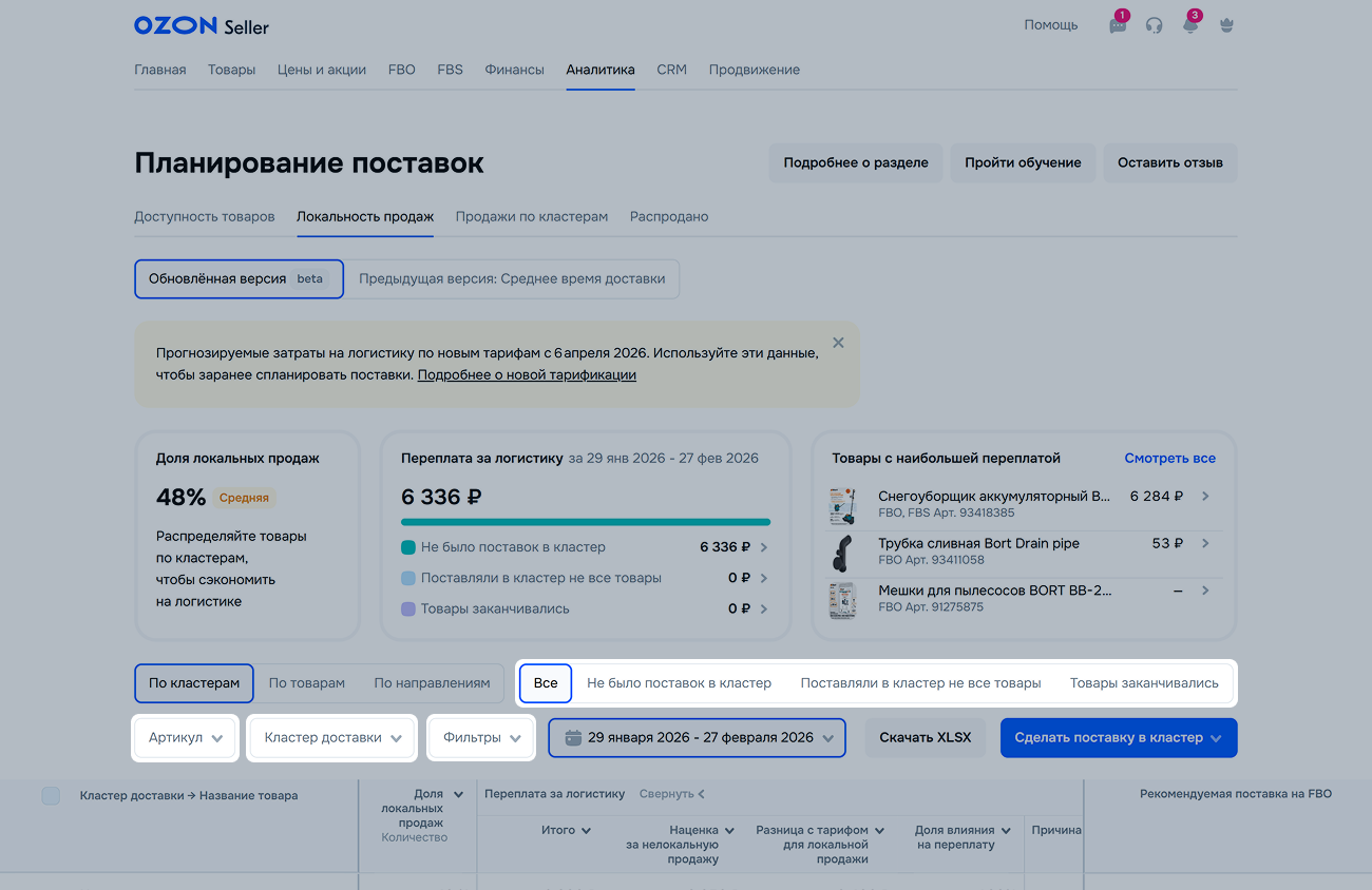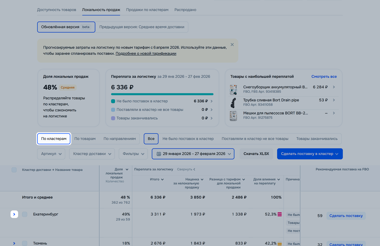 | Доля влияния на переплату | Узнайте, как кластер, товар или направление влияет на переплату за логистику. Так вы поймёте, на какие товары и кластеры обратить больше внимания при планировании поставок. |
