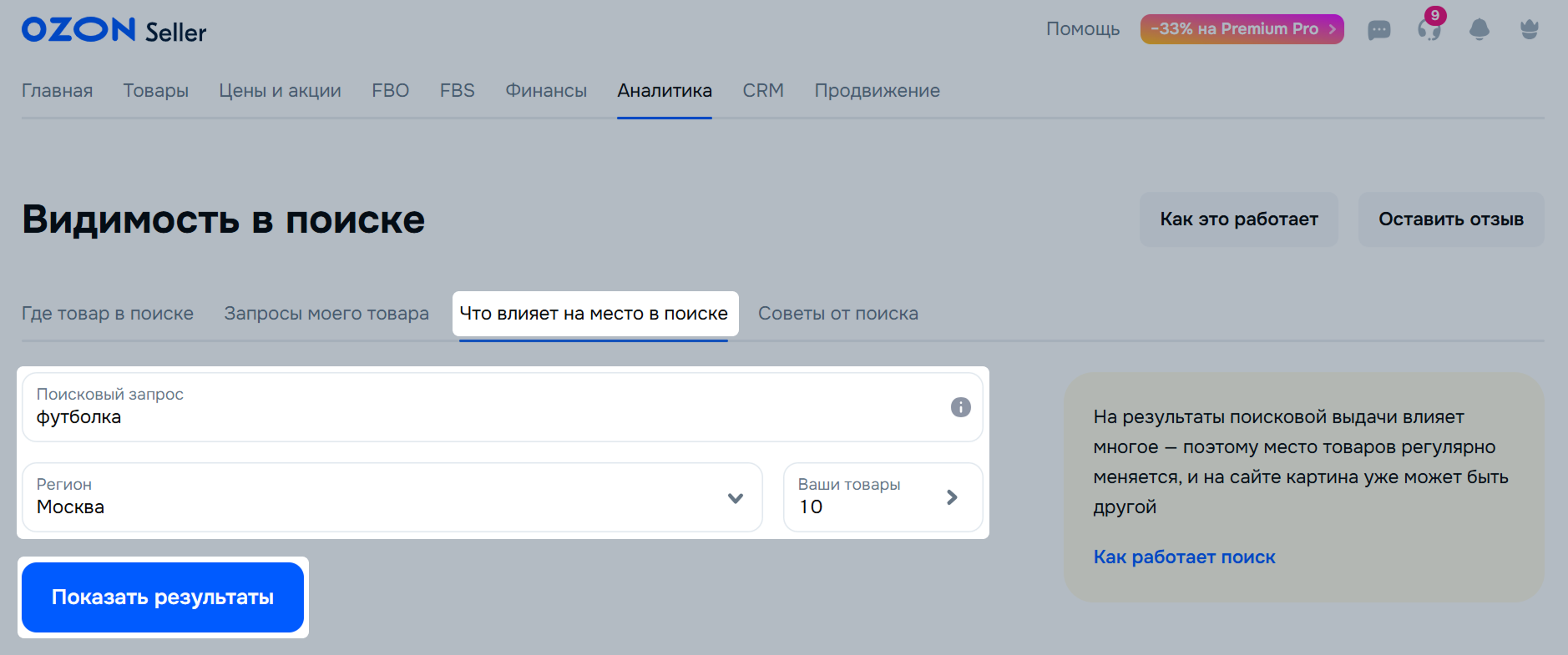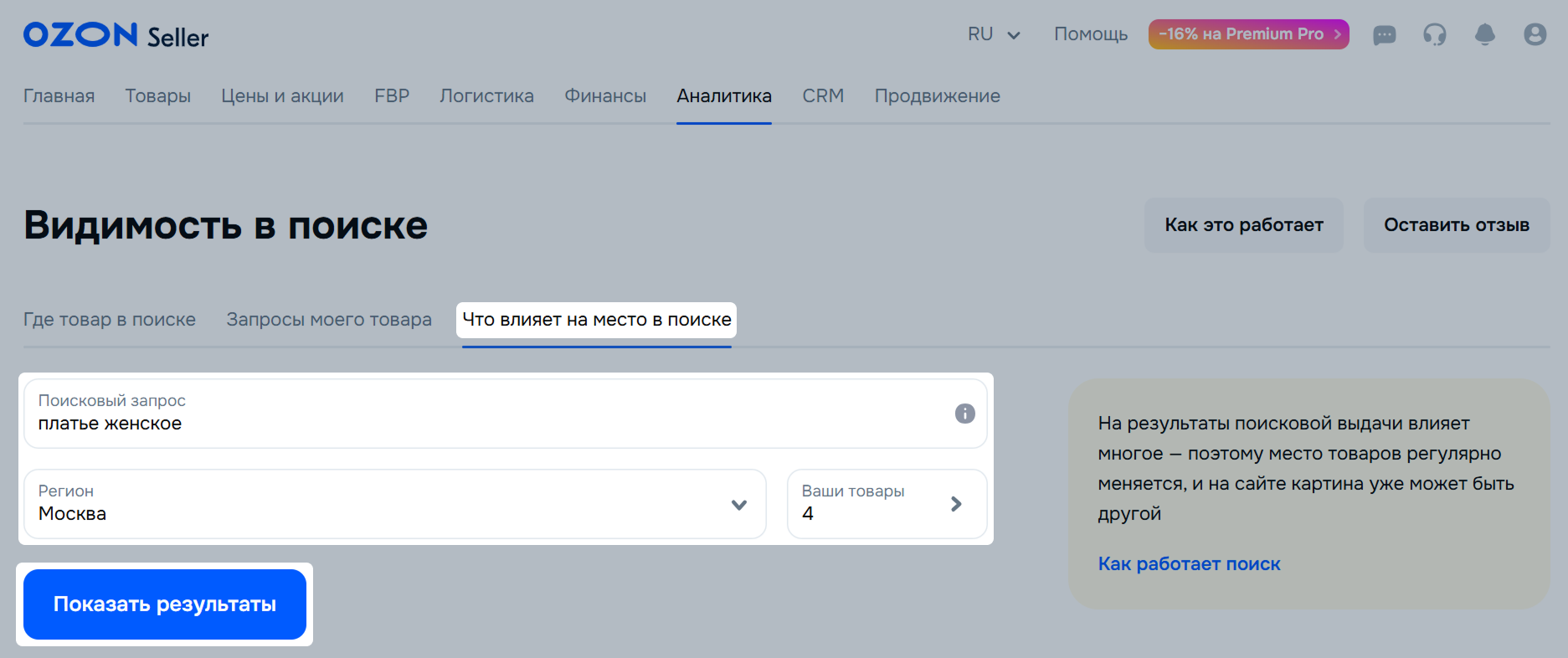 С помощью инструмента «Что влияет на место в поиске» вы можете проанализировать товары в поиске и понять, почему предложение находится на той или иной позиции.