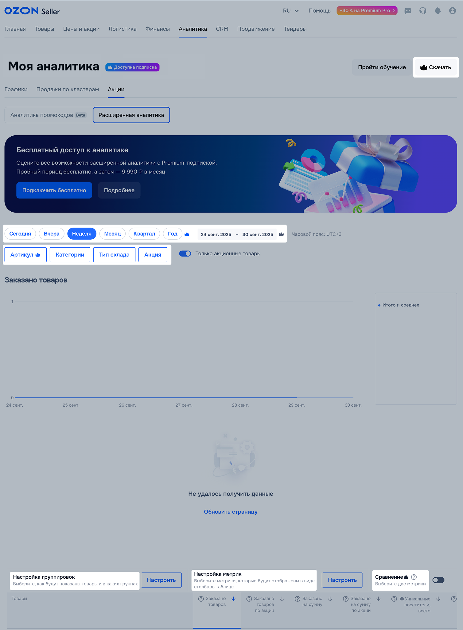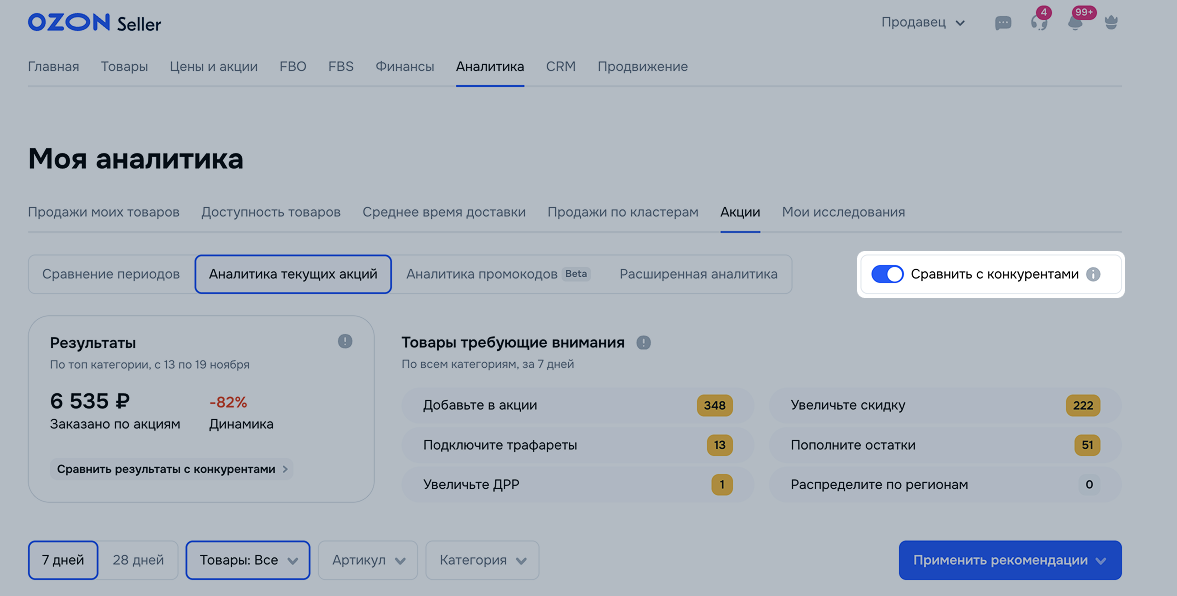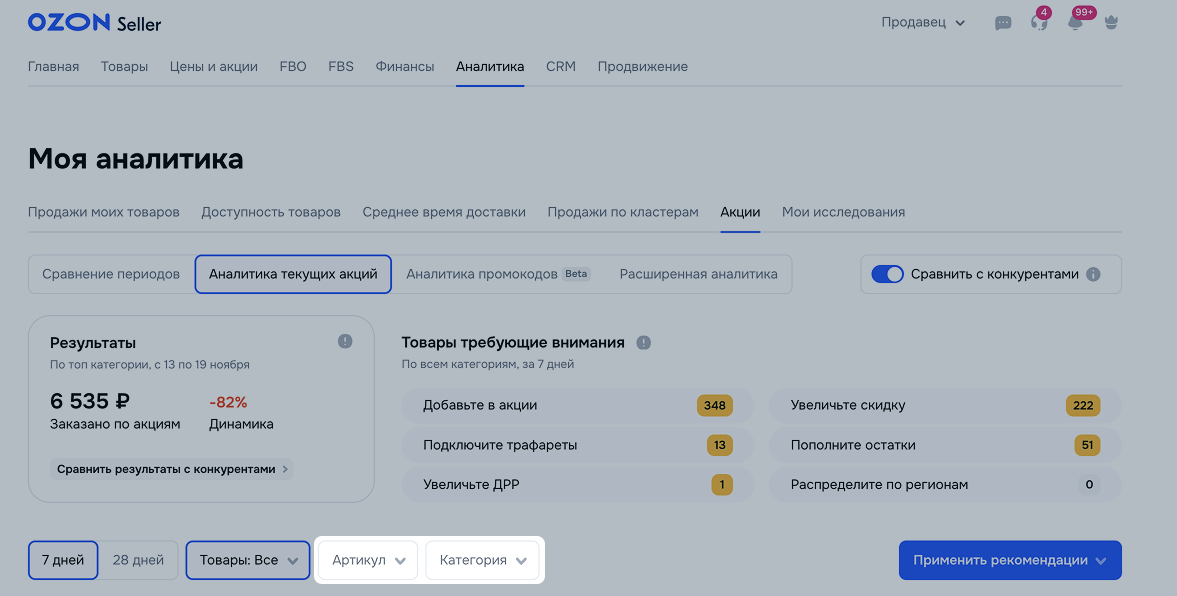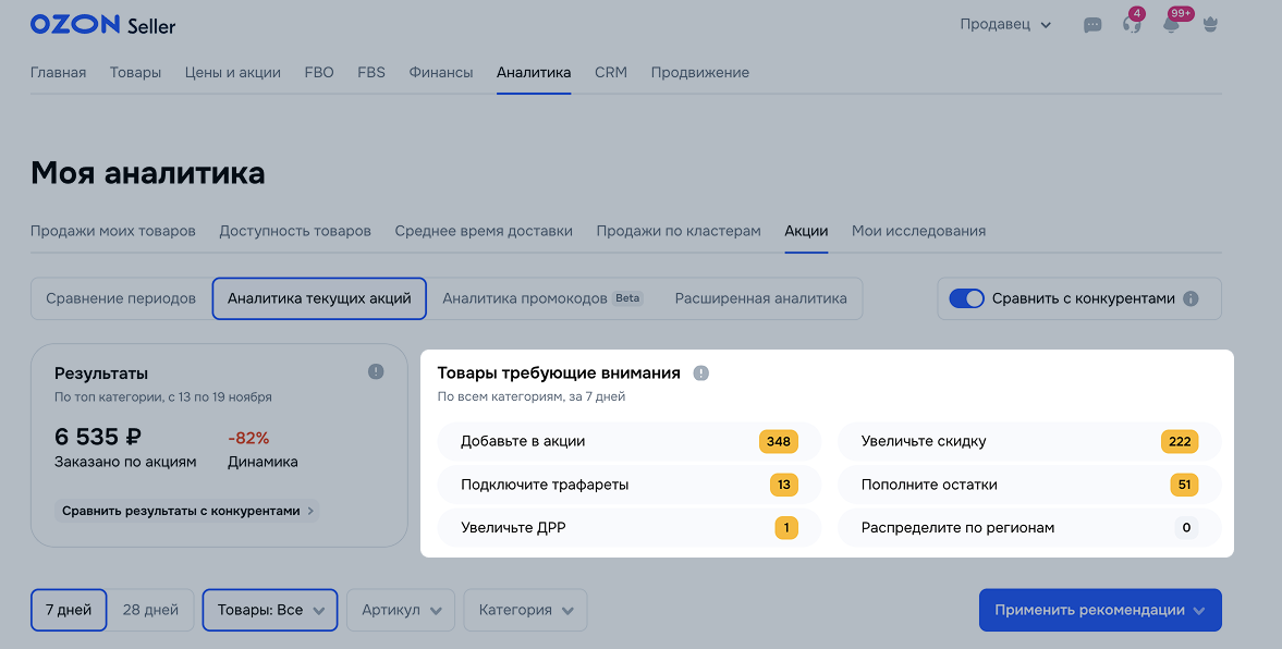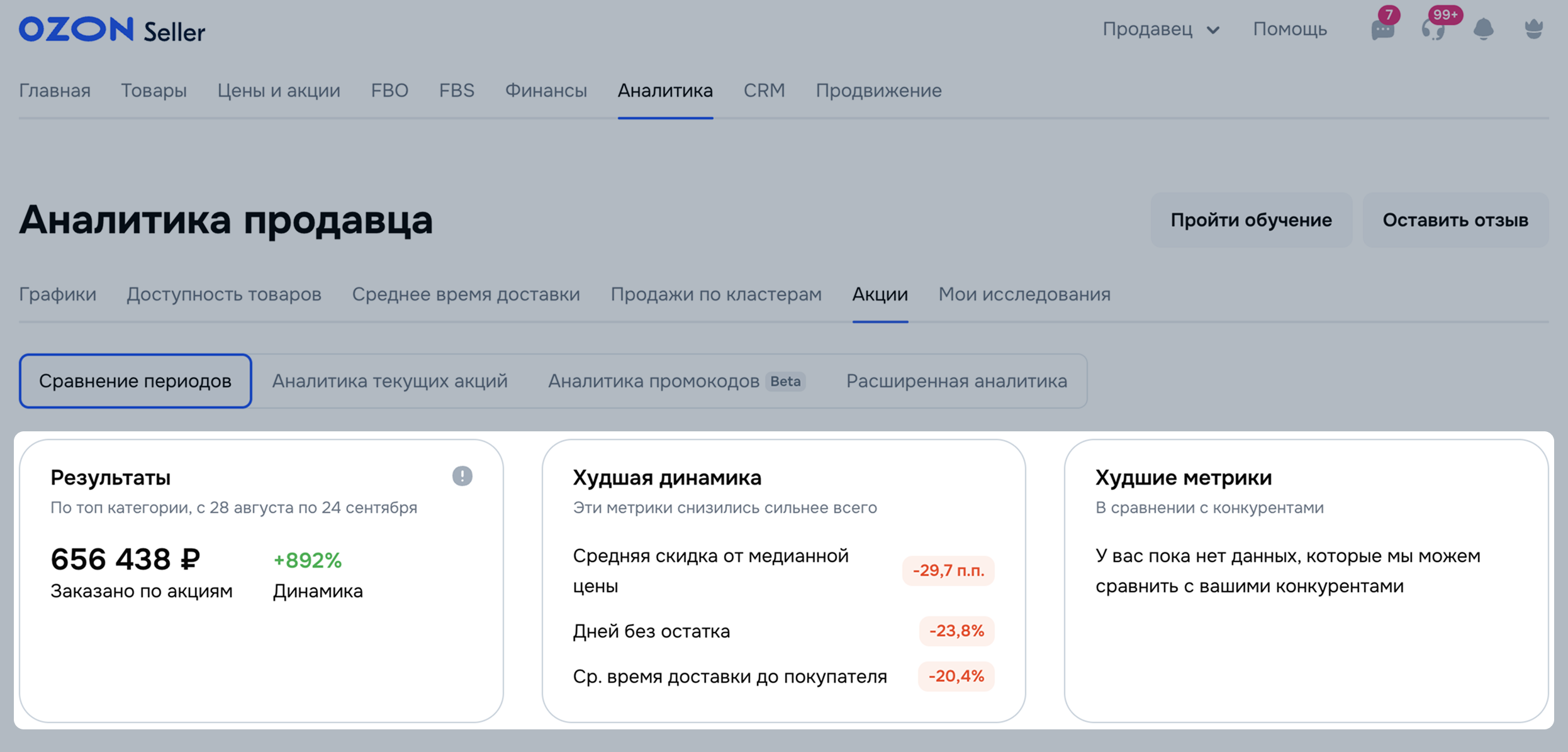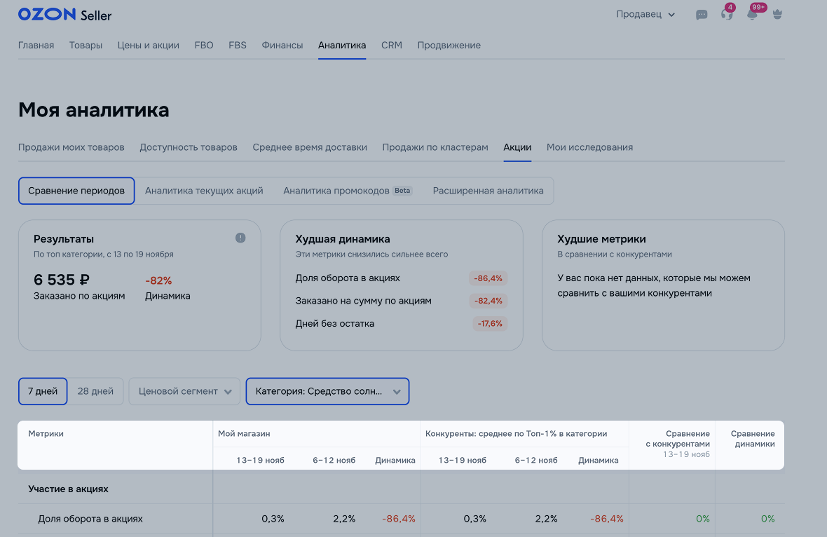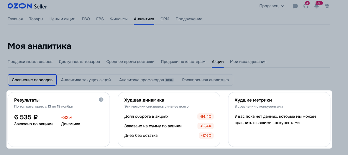 В разделе Аналитика → Акции можно посмотреть, как акции влияют на количество заказов, заработок и просмотры, и принять решение о дальнейшем продвижении, выборе акционных механик и размере скидок. Учитываем Акции от Ozon и Мои акции.