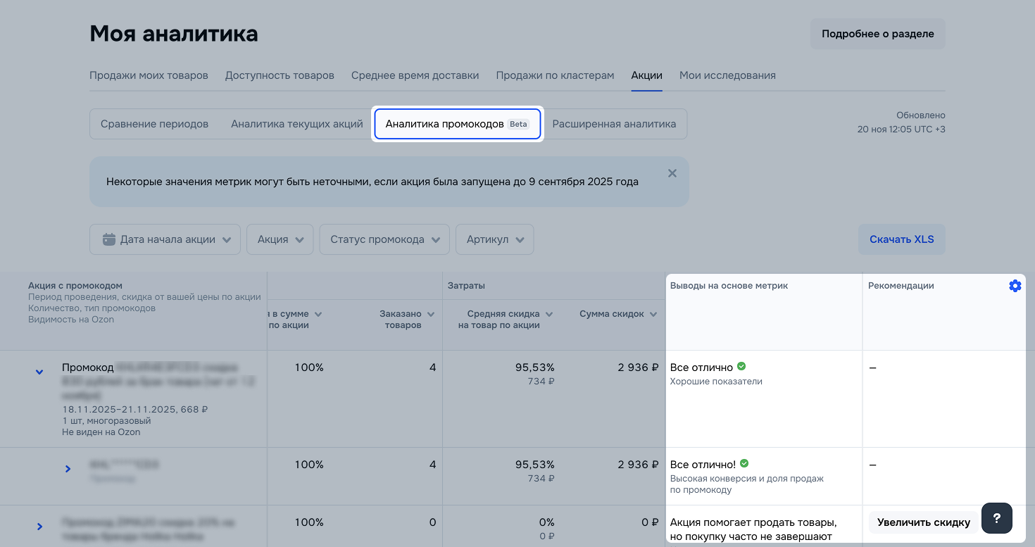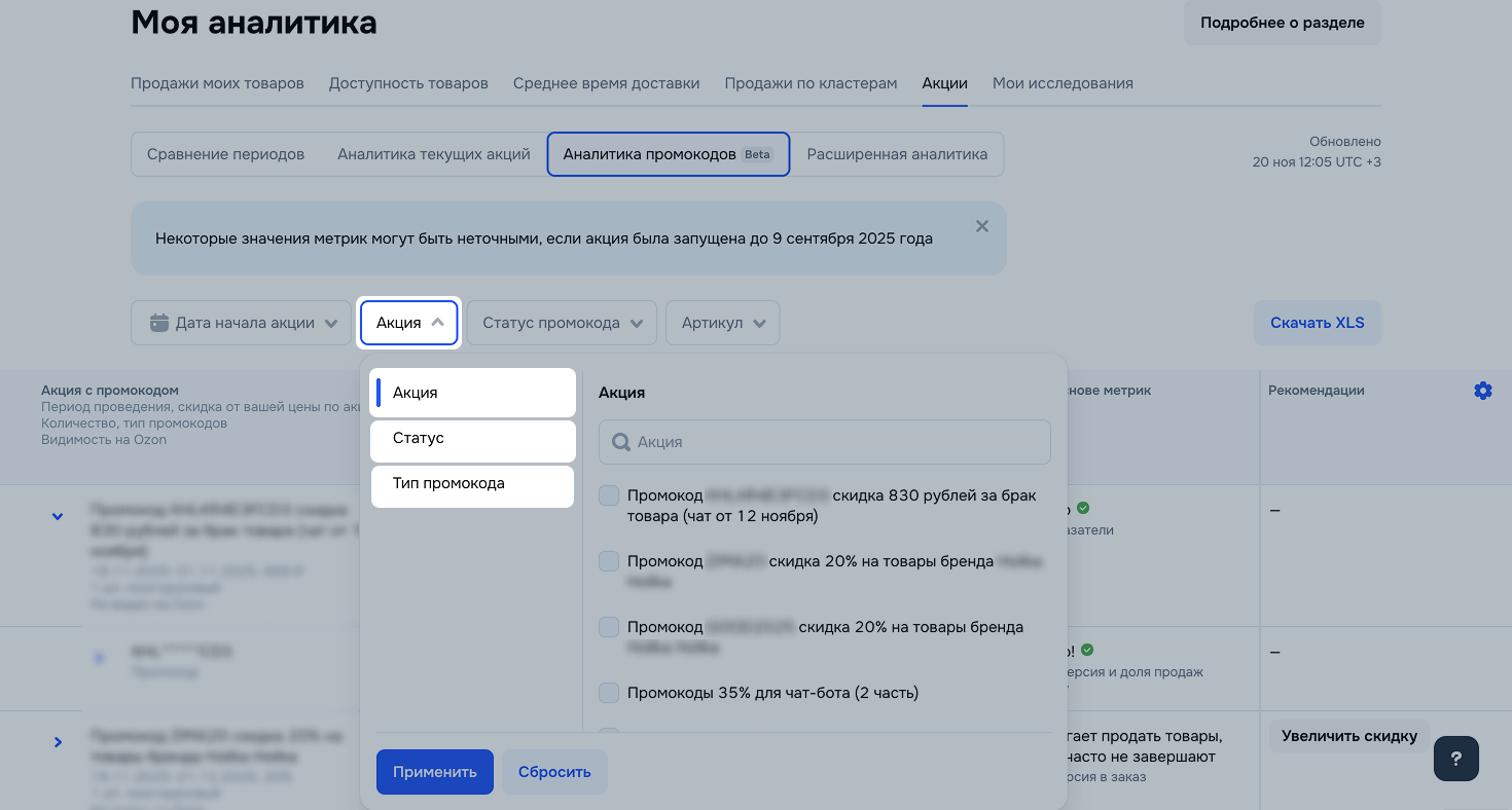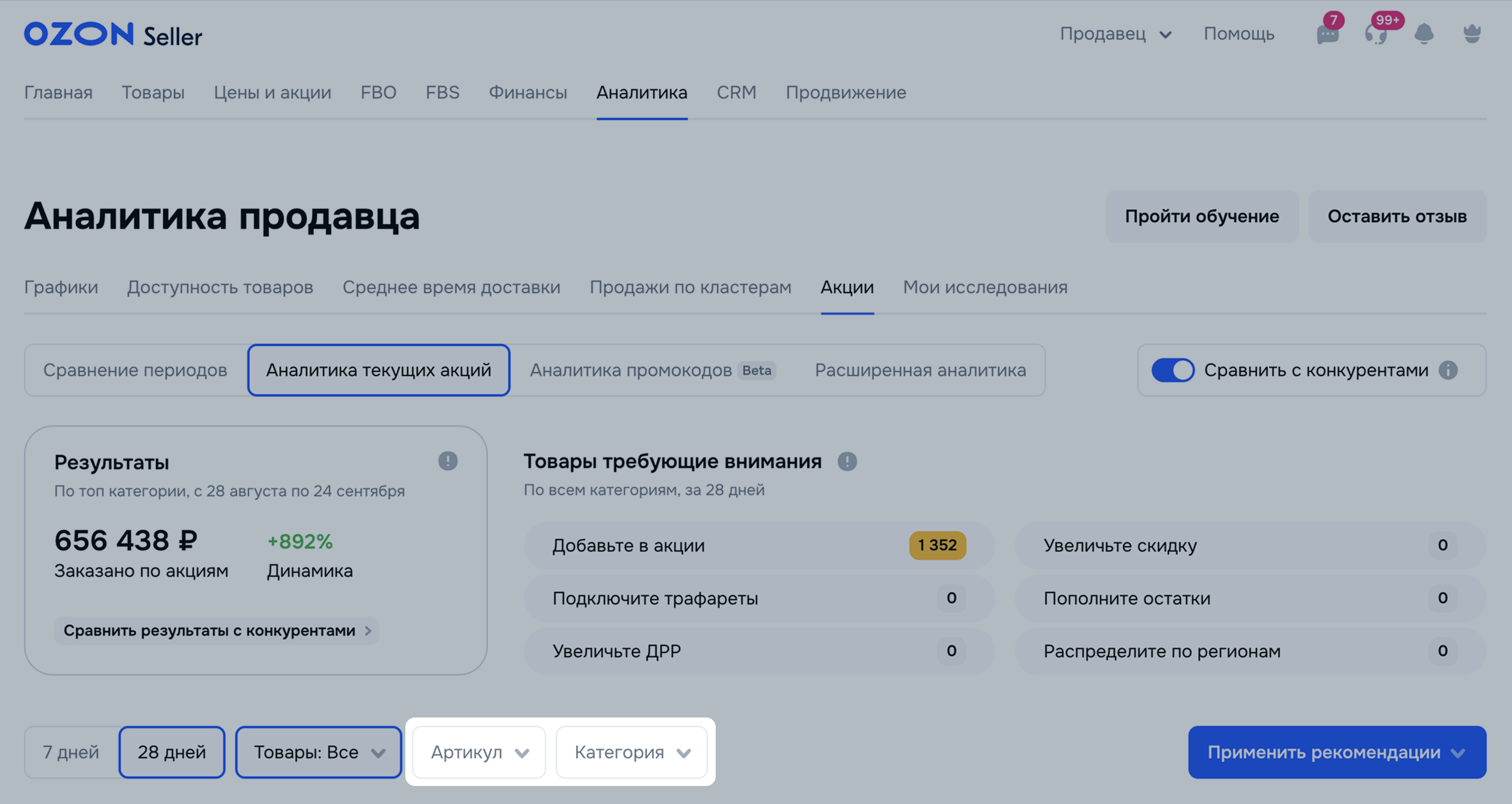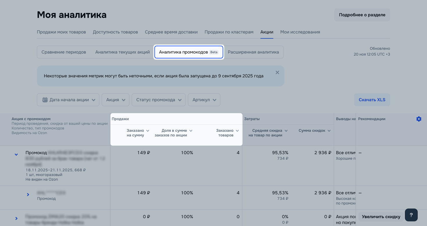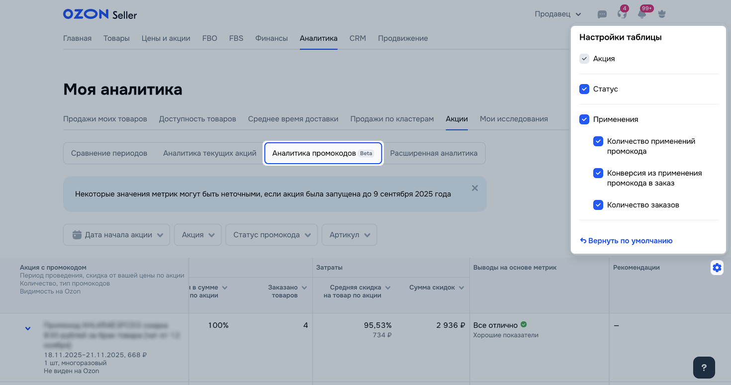 В разделе Аналитика → Акции можно посмотреть, как акции влияют на количество заказов, заработок и просмотры, и принять решение о дальнейшем продвижении, выборе акционных механик и размере скидок. Учитываем Акции от Ozon и Мои акции.