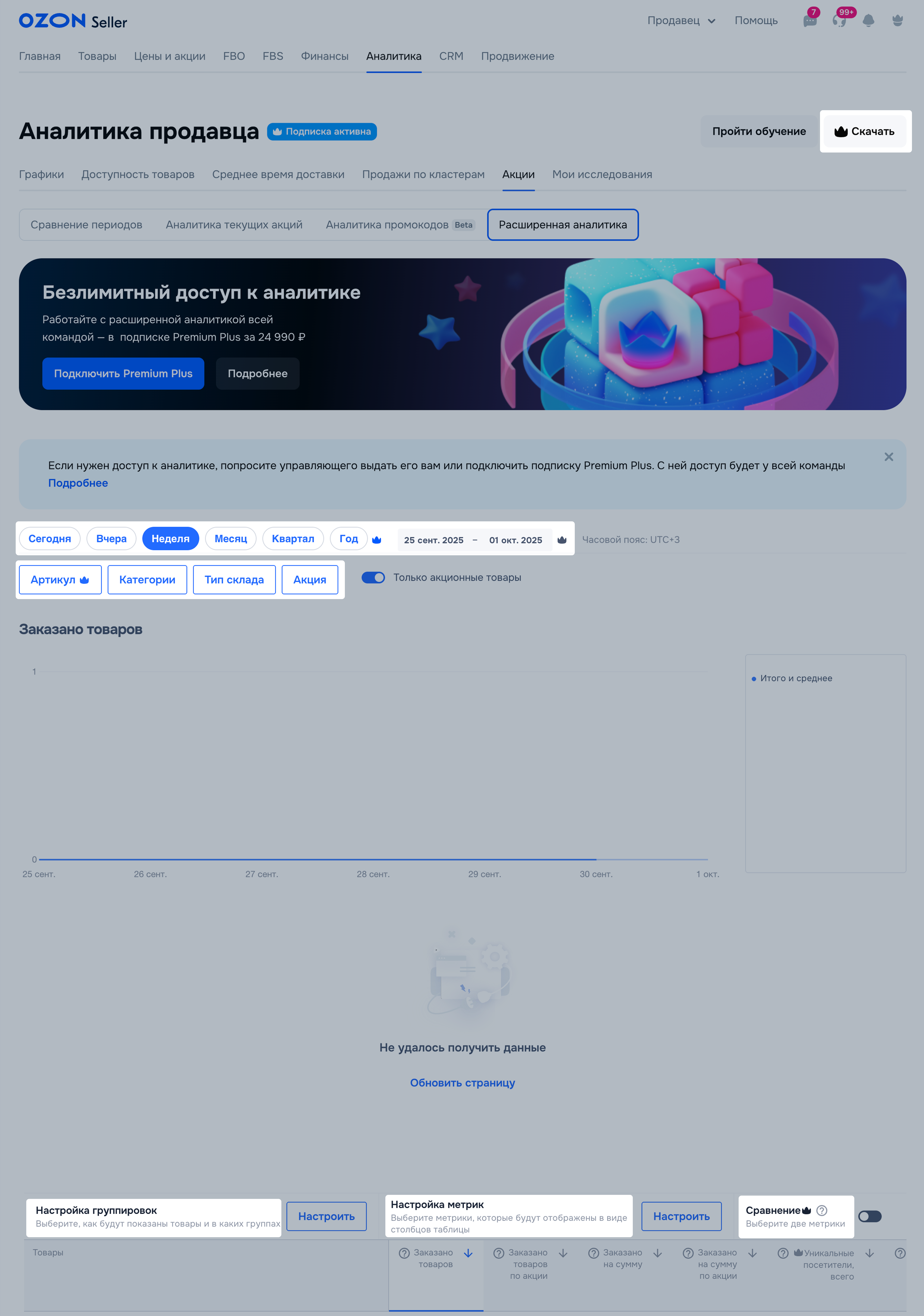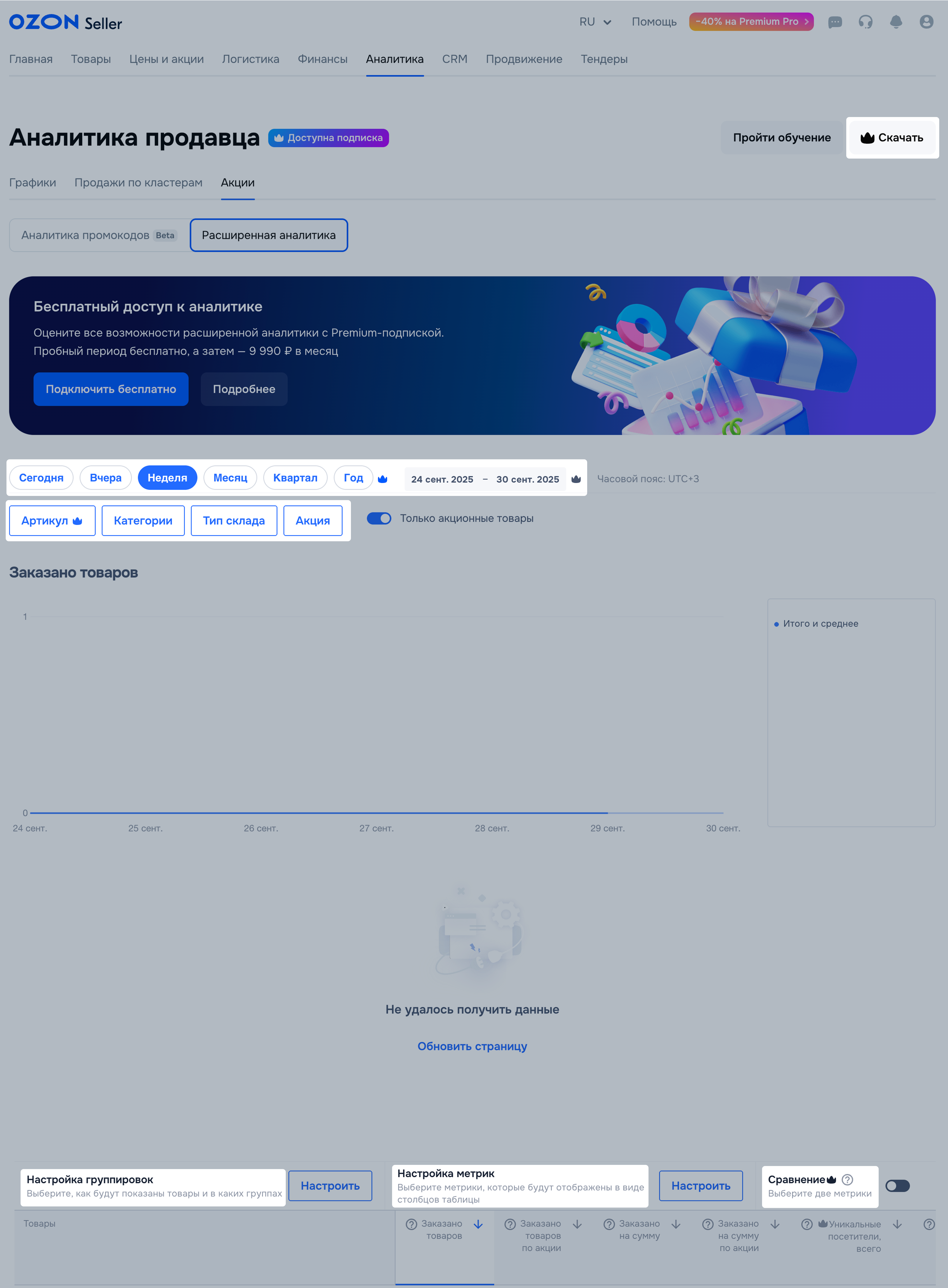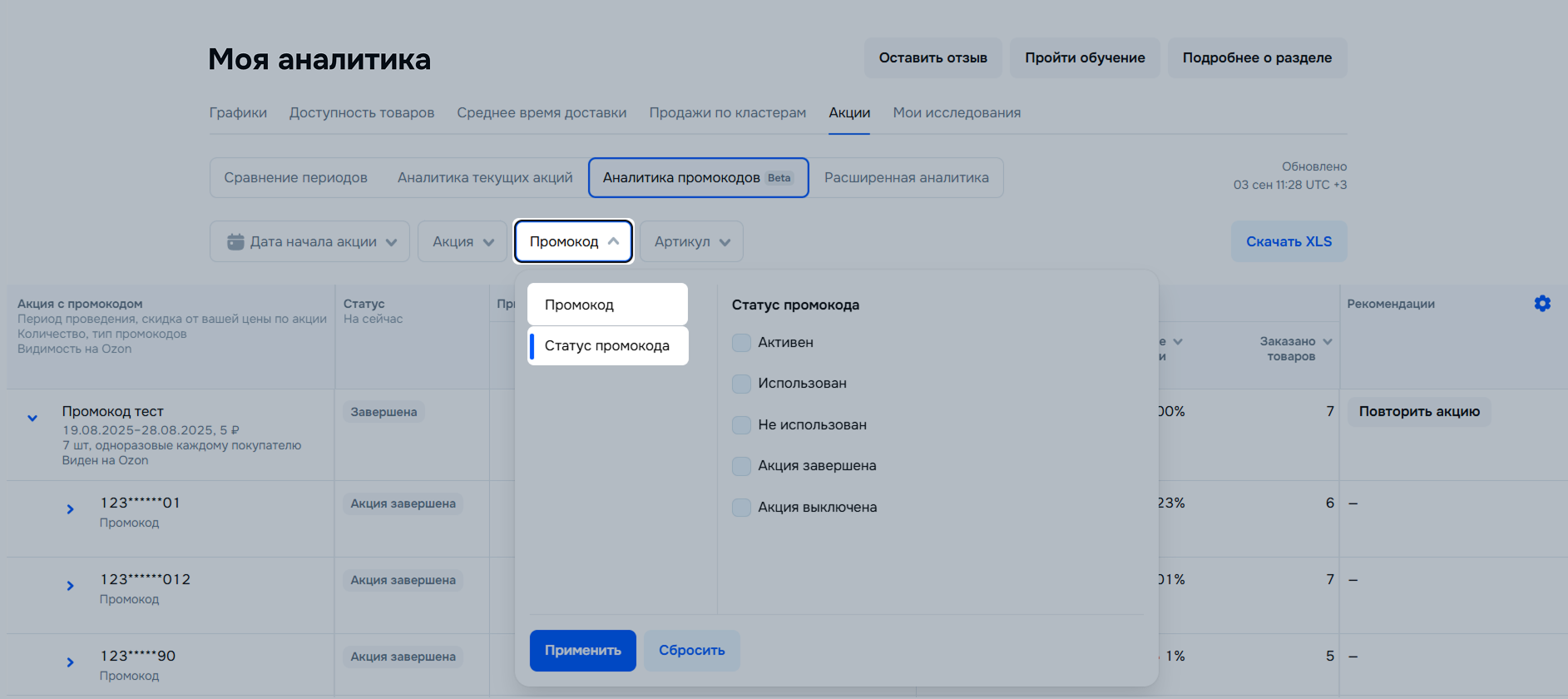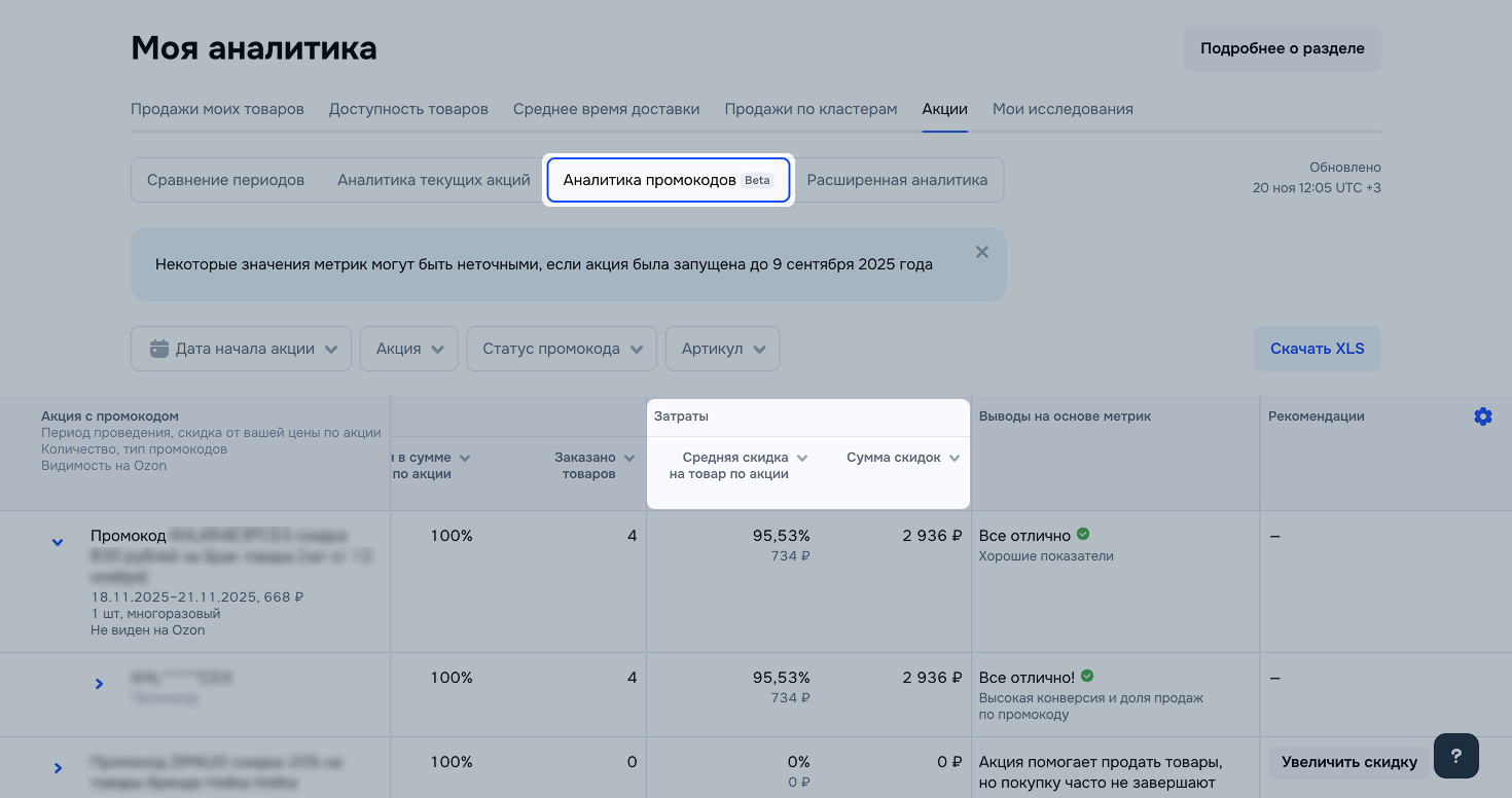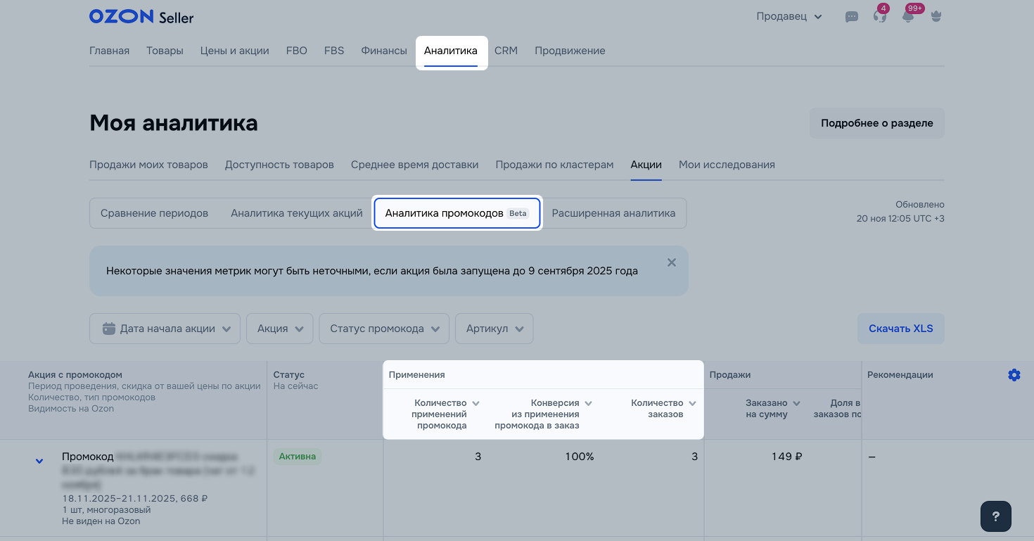 В разделе Аналитика → Акции можно посмотреть, как акции влияют на количество заказов, заработок и просмотры, и принять решение о дальнейшем продвижении, выборе акционных механик и размере скидок. Учитываем Акции от Ozon и Мои акции.