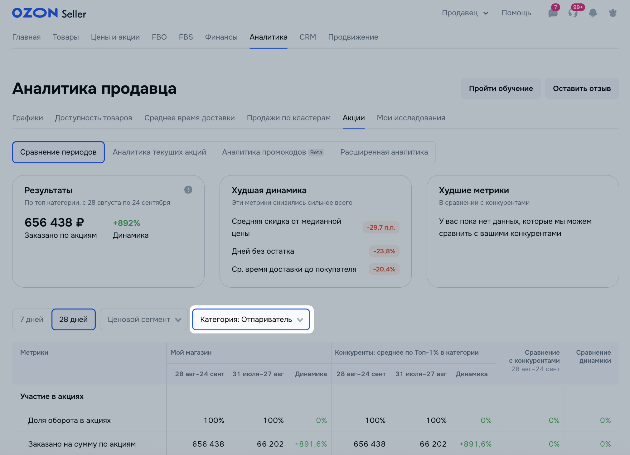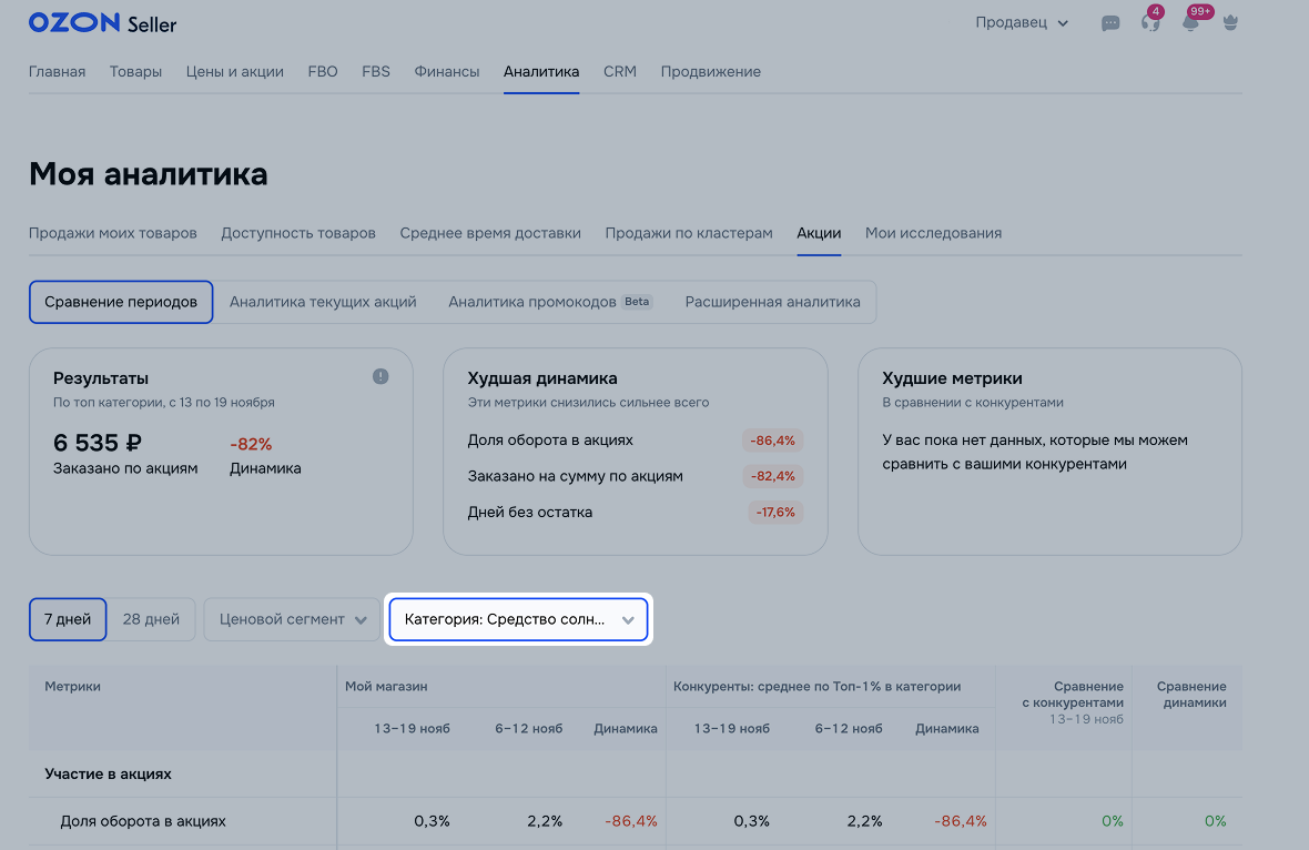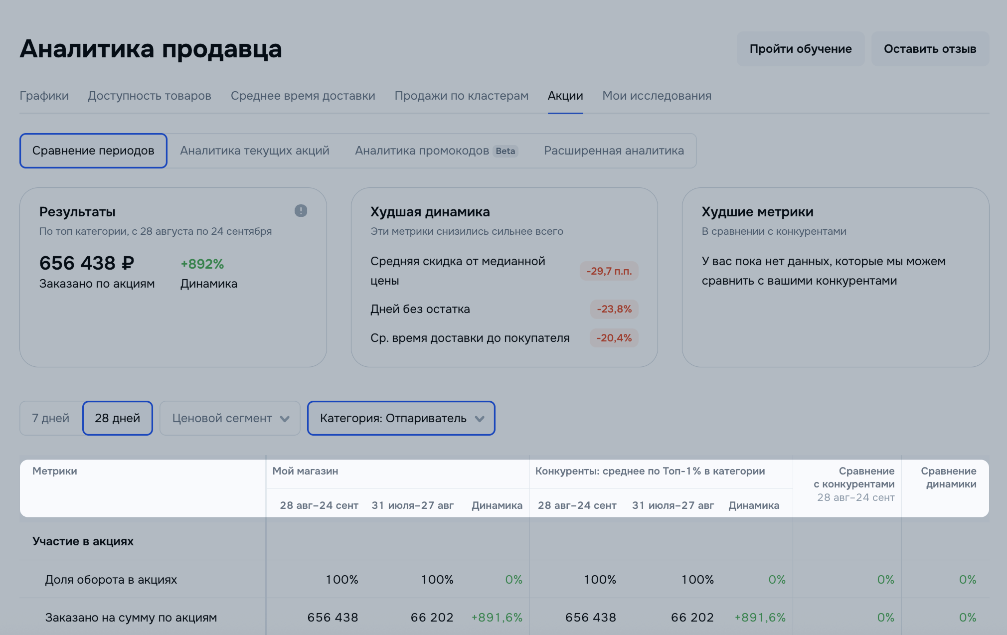В разделе Аналитика → Акции → Сравнение периодов вы можете посмотреть, как менялись ваши показатели по акциям за последние 7 или 28 дней, и сравнить их с показателями конкурентов за тот же период.