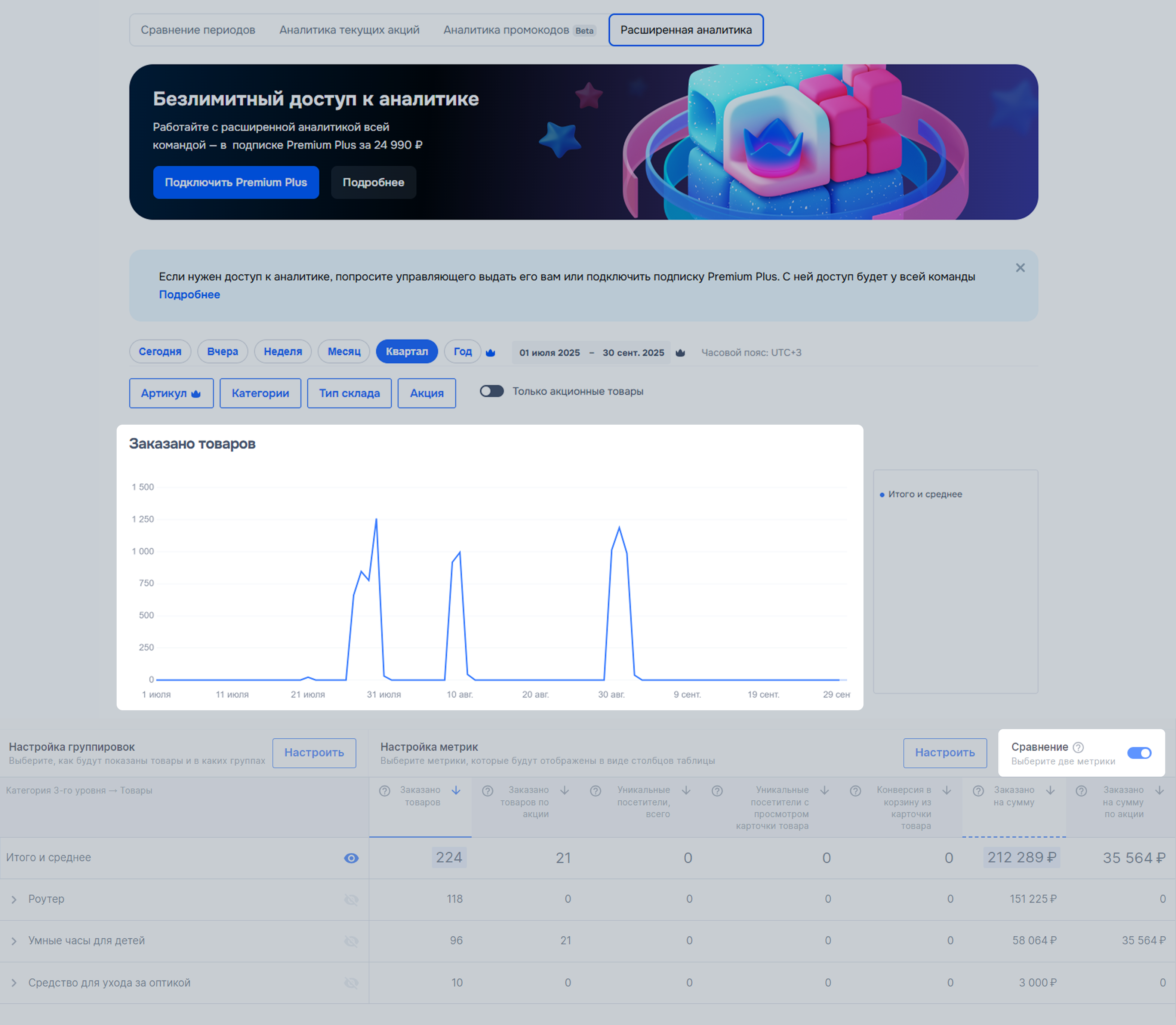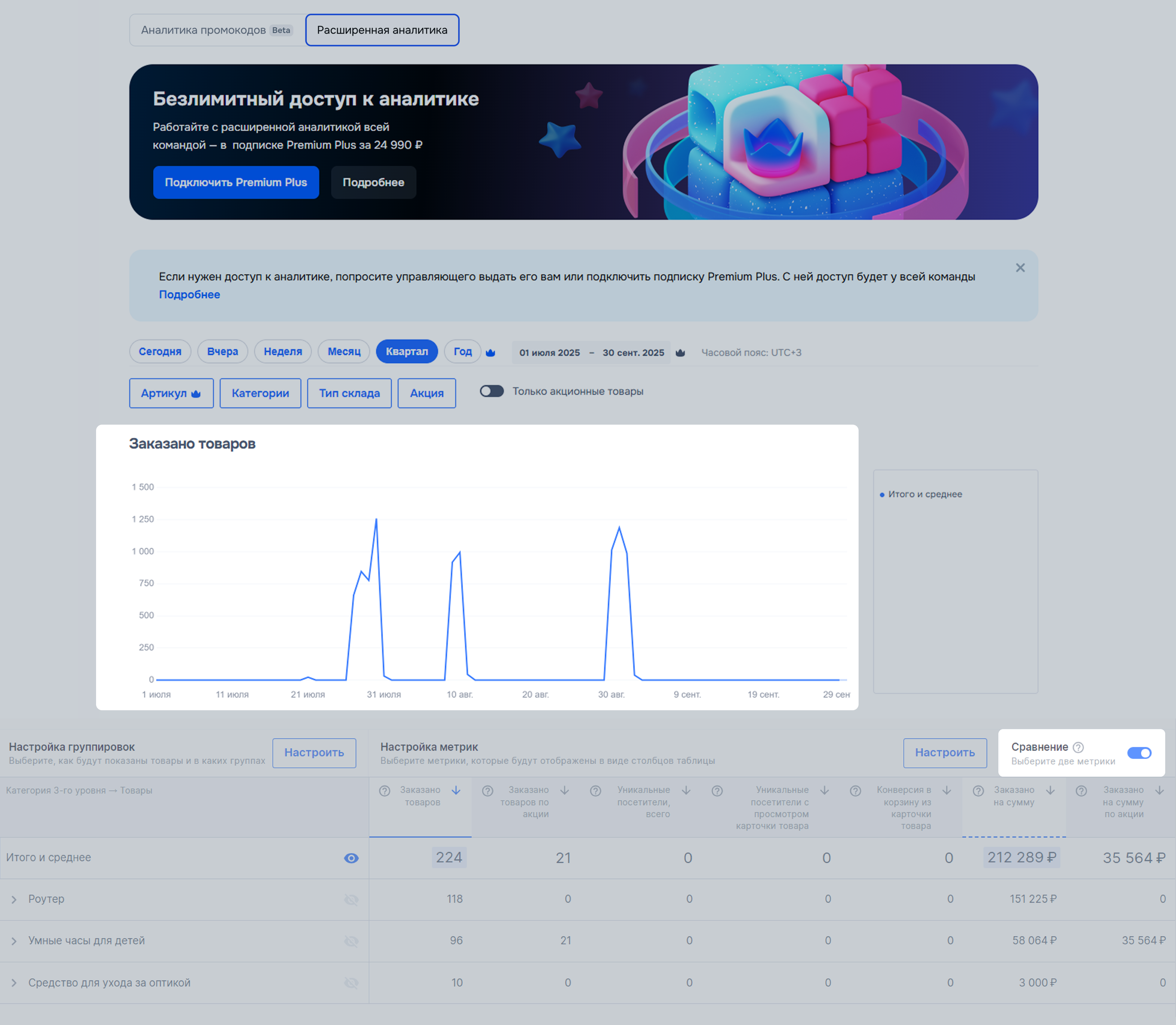Метрики отвечают за данные, которые будут в таблице и на графике для каждого товара. Они объединены в готовые наборы: