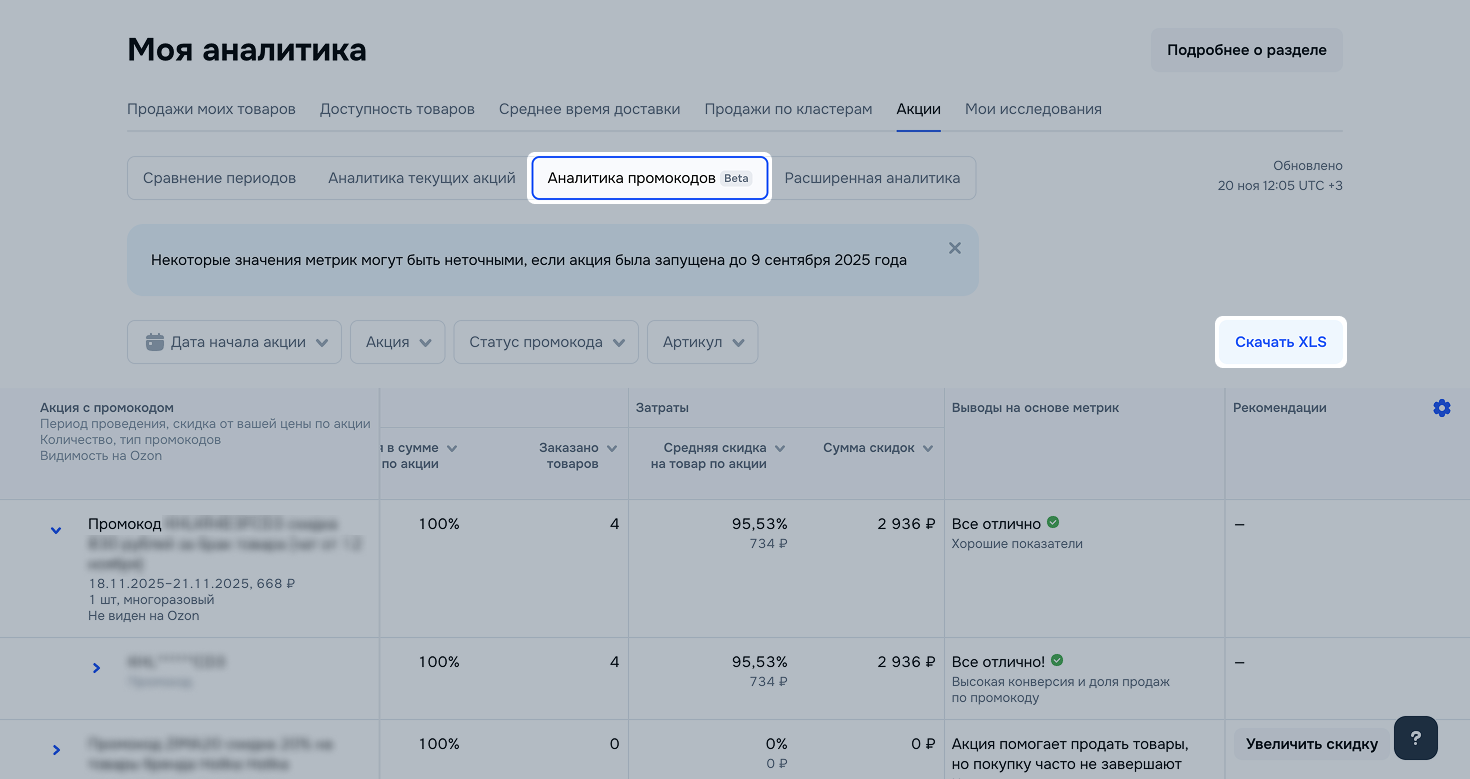 С подпиской Premium Plus и Premium Pro вы можете скачать аналитику промокодов в формате XLS-отчёта. Для этого нажмите Скачать XLS.
