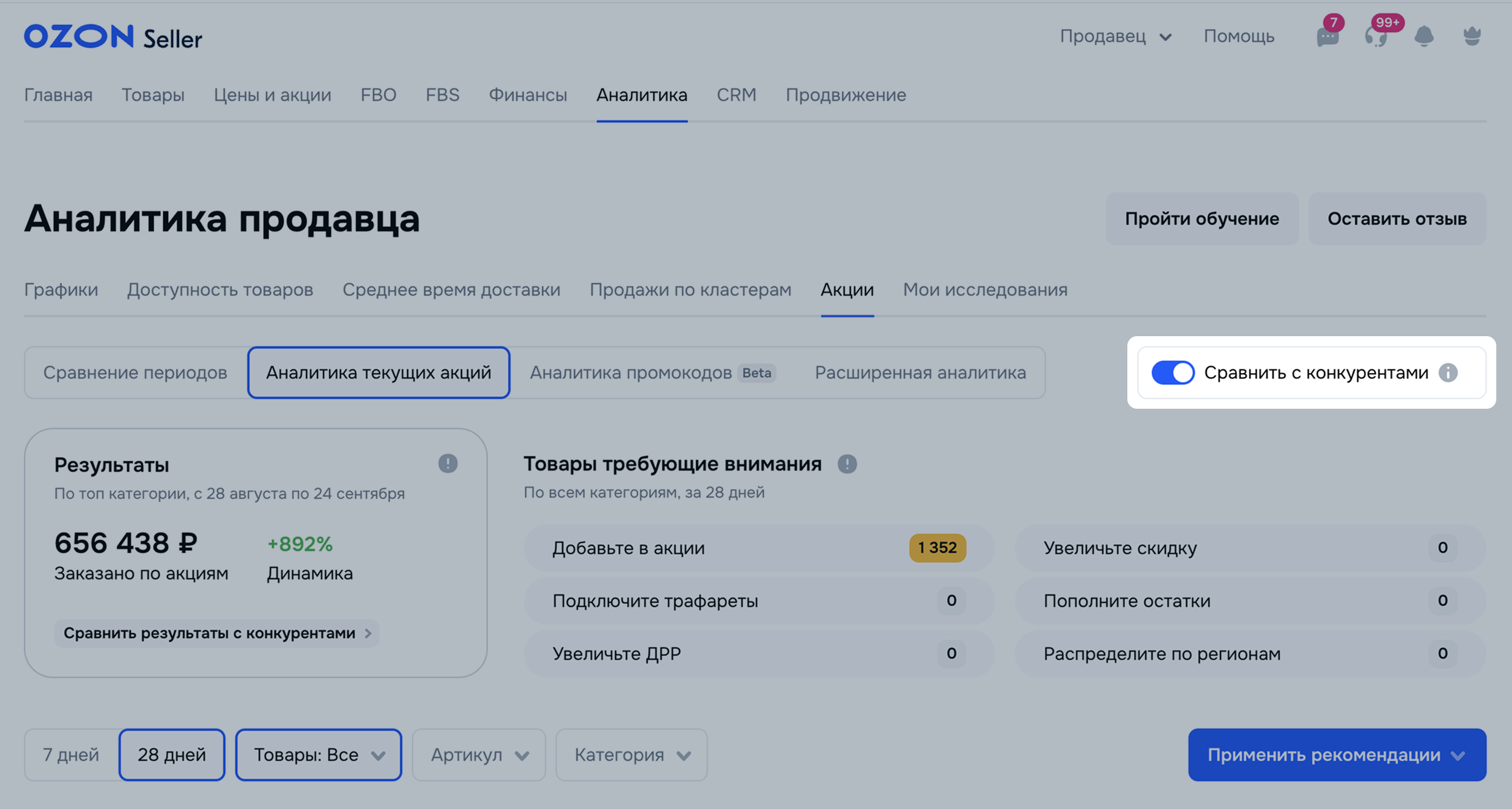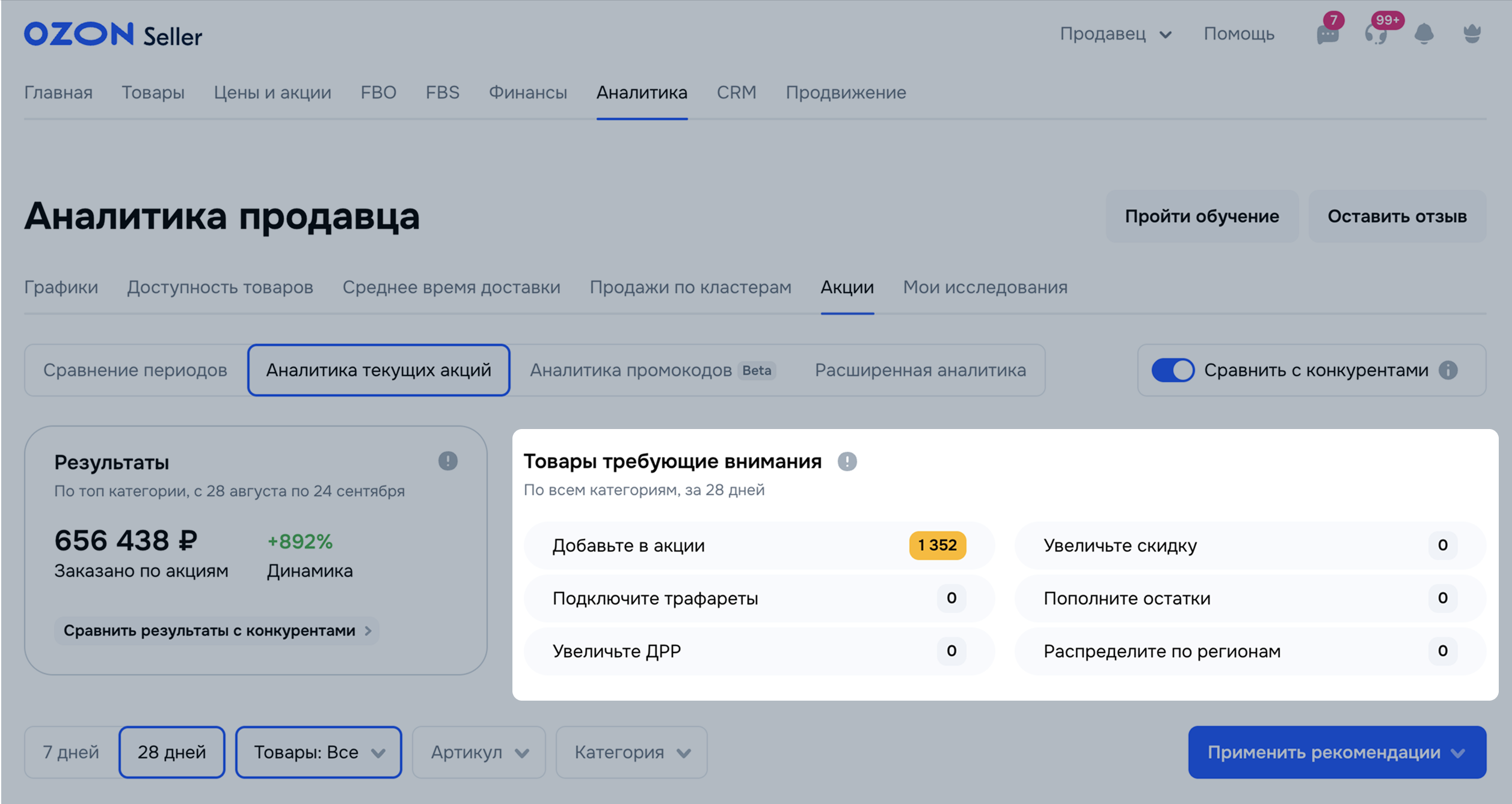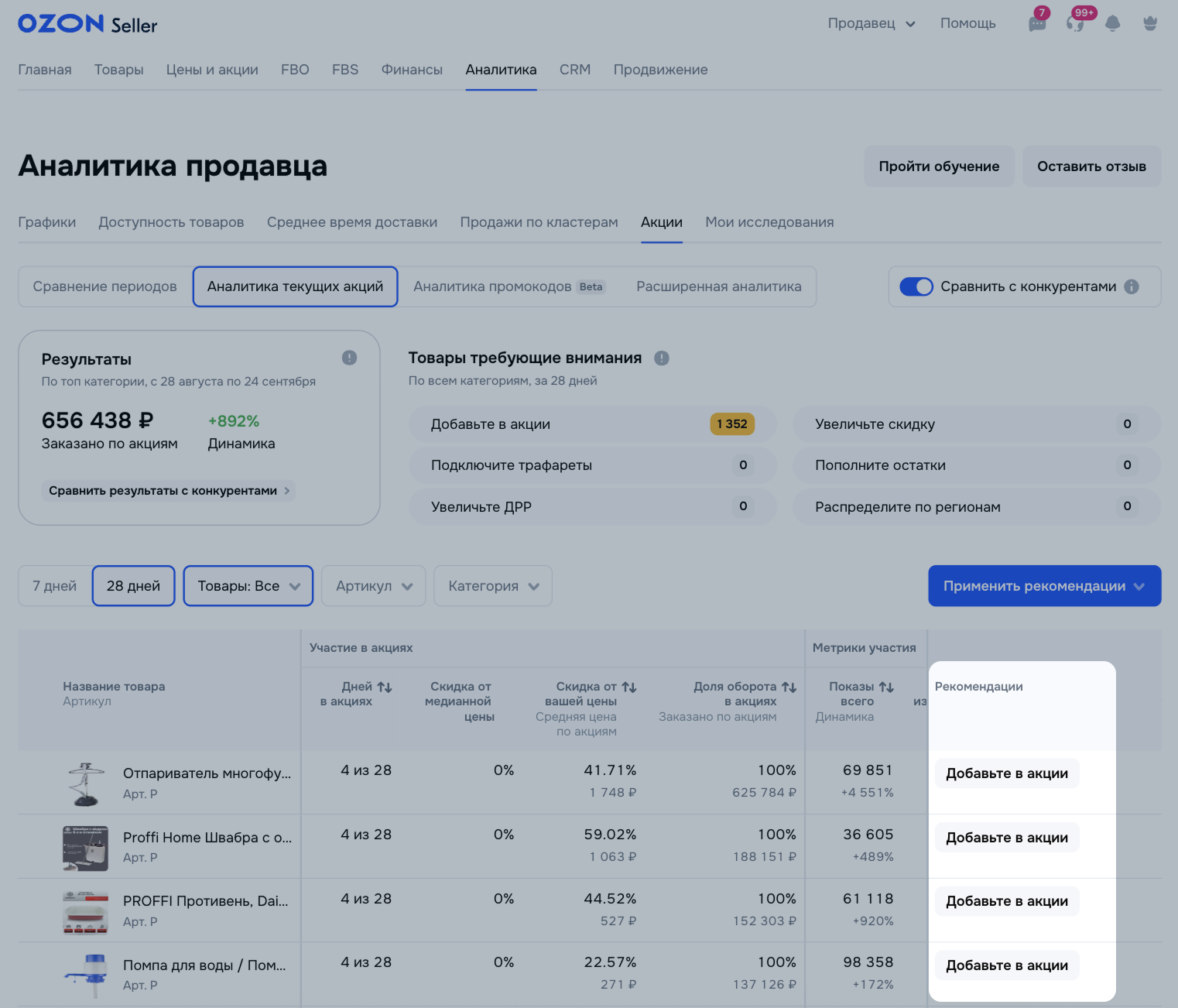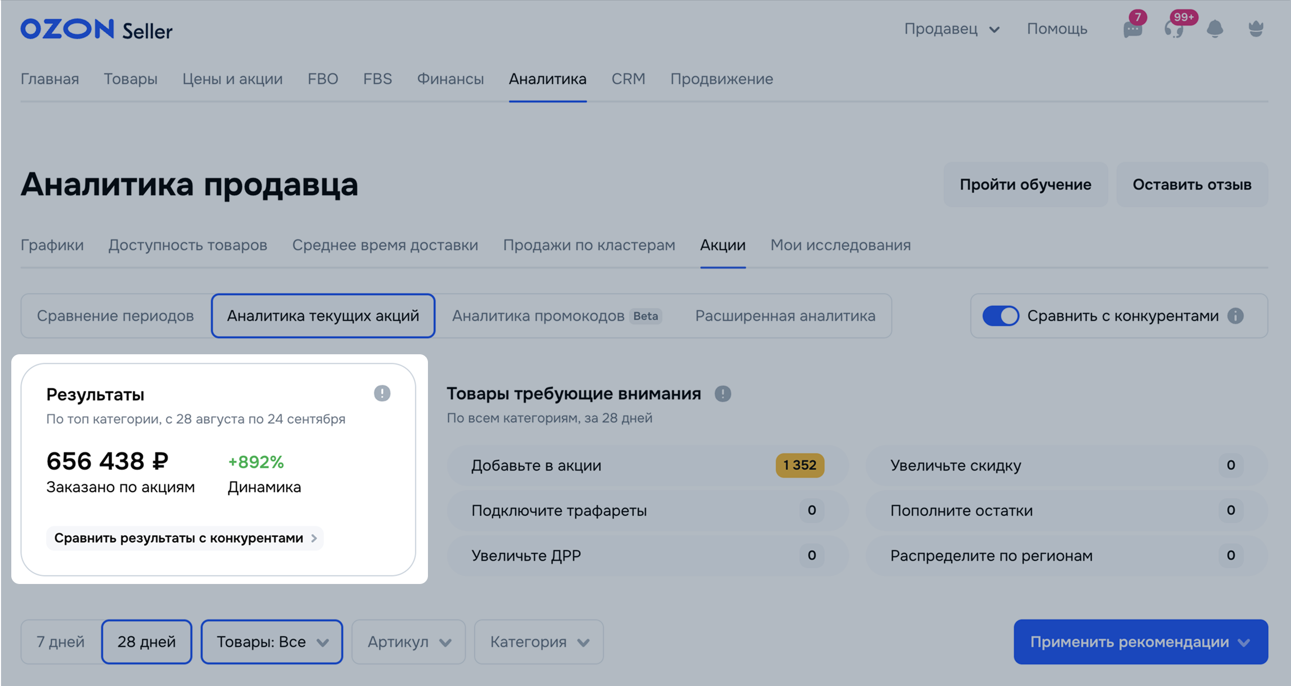 В разделе Аналитика текущих акций показываем информацию по каждому вашему товару, участвующему в акции за последние 7 или 28 дней.