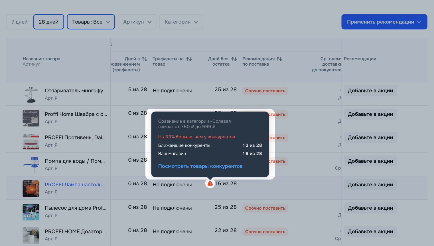 В виджете Товары требующие внимания показываем, для скольки товаров применима каждая рекомендация.