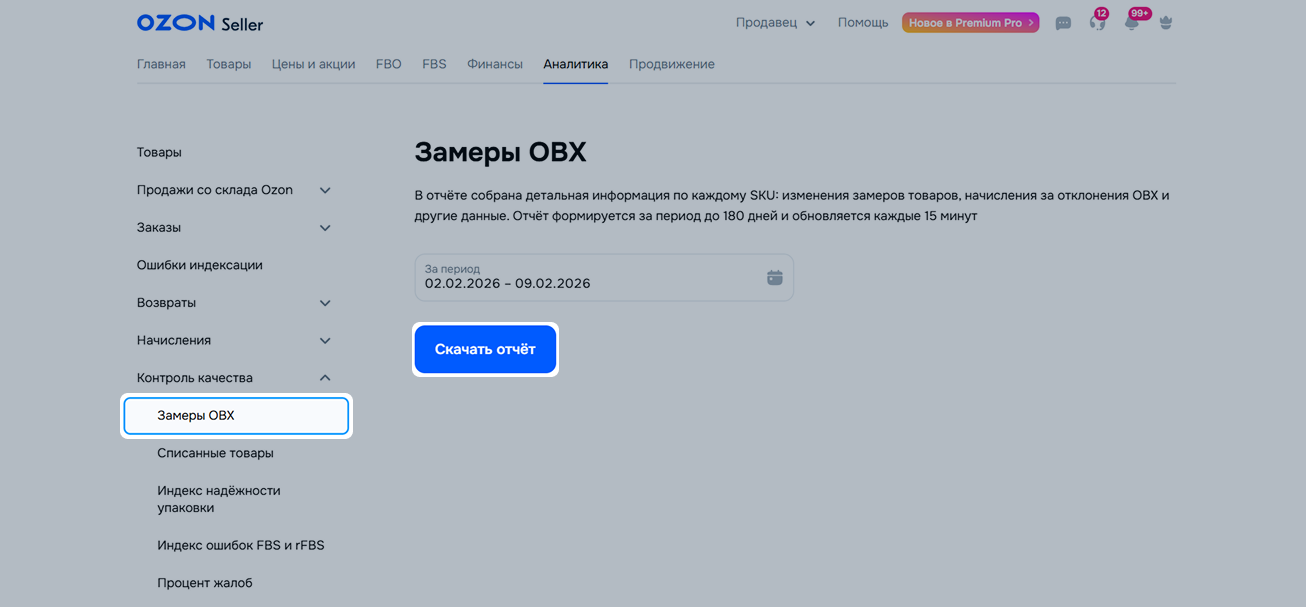 Чтобы скачать детализацию по замерам ОВХ в формате XLSX, перейдите в раздел Аналитика → Отчёты → Контроль качества → Замеры ОВХ, выберите период и нажмите Скачать отчёт.