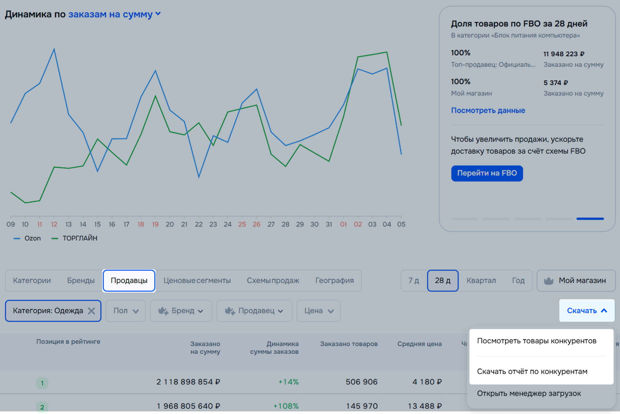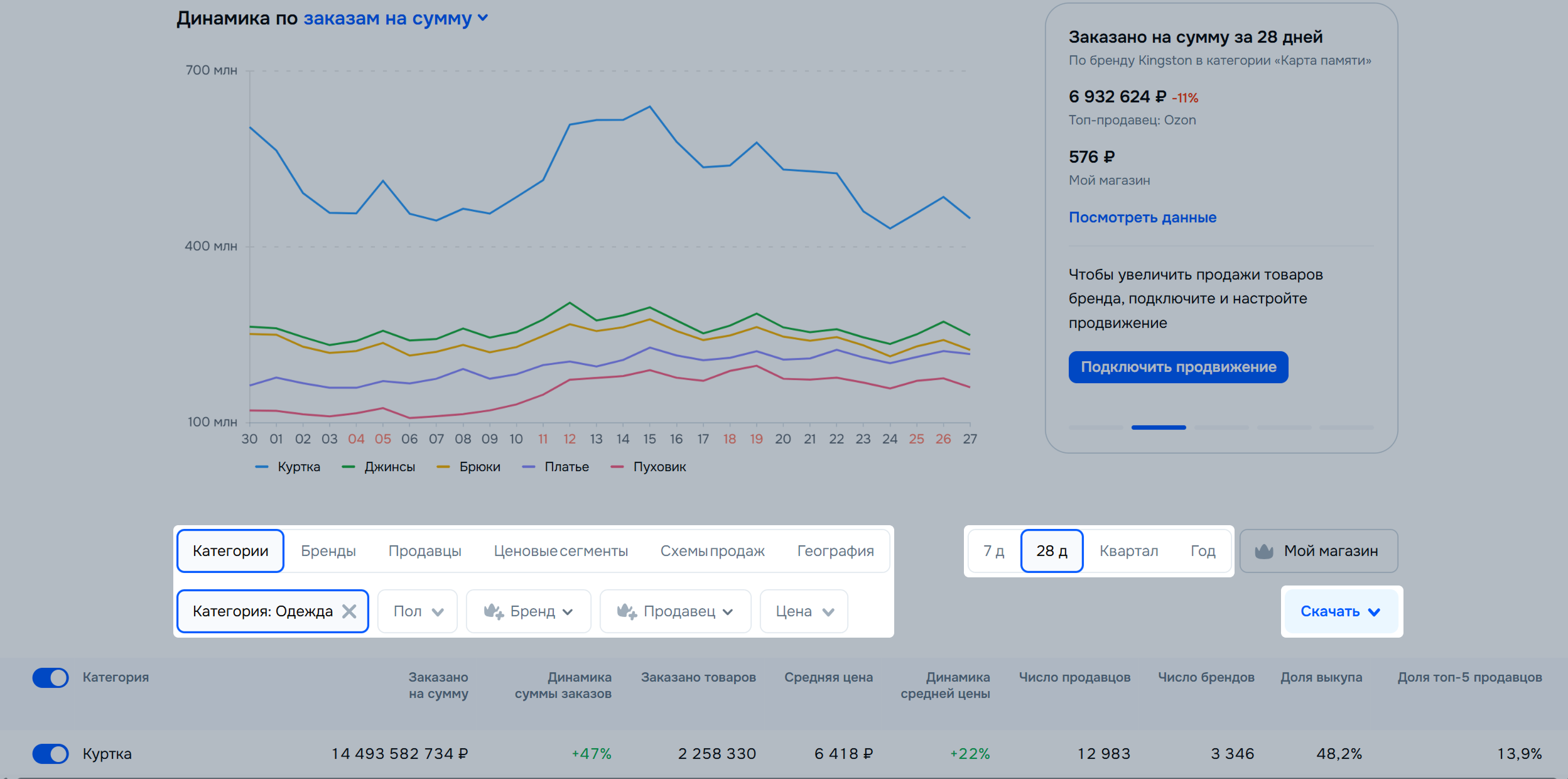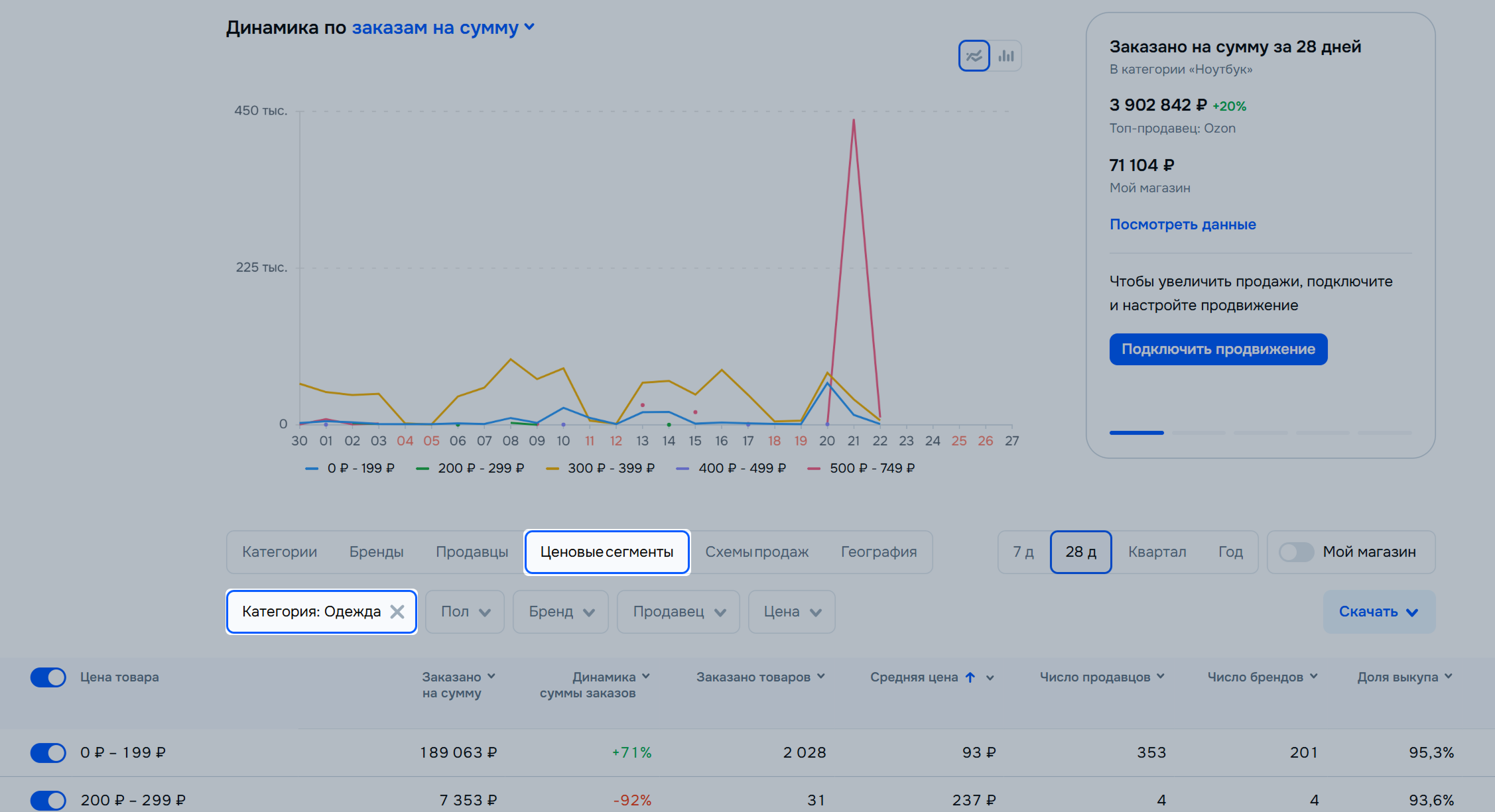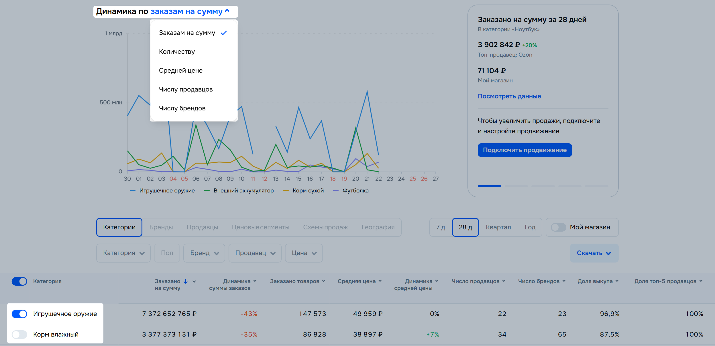 Например, по данным за год можно проверить сезонность категории или оценить динамику продаж в долгосрочной перспективе. Чтобы посмотреть более свежие данные, например, уровень конкуренции или количество продавцов в конкретной категории, выберите 7 или 28 дней.