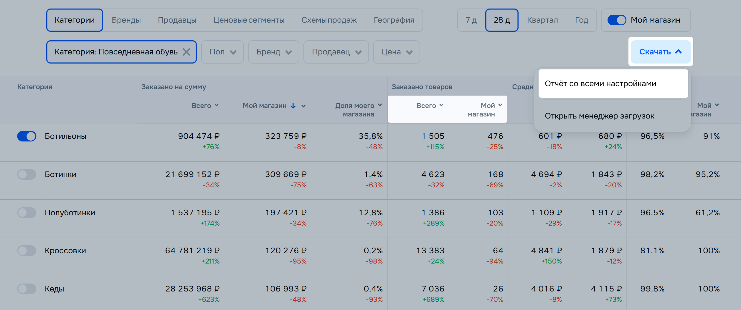 Чтобы скачать отчёт в формате XLSX, нажмите Скачать → Отчёт со всеми настройками.