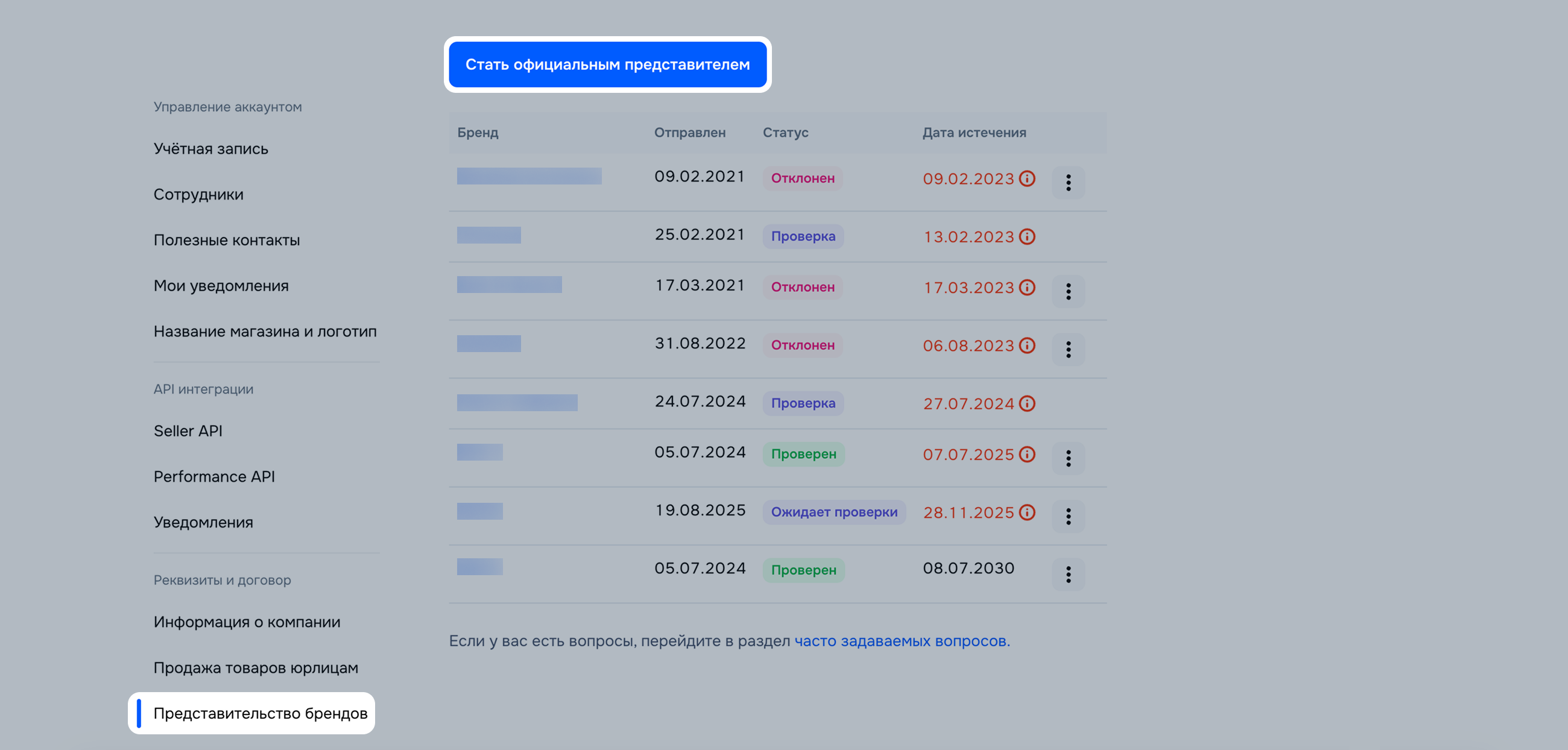В разделе Настройки → Представительство брендов нажмите Стать официальным представителем.