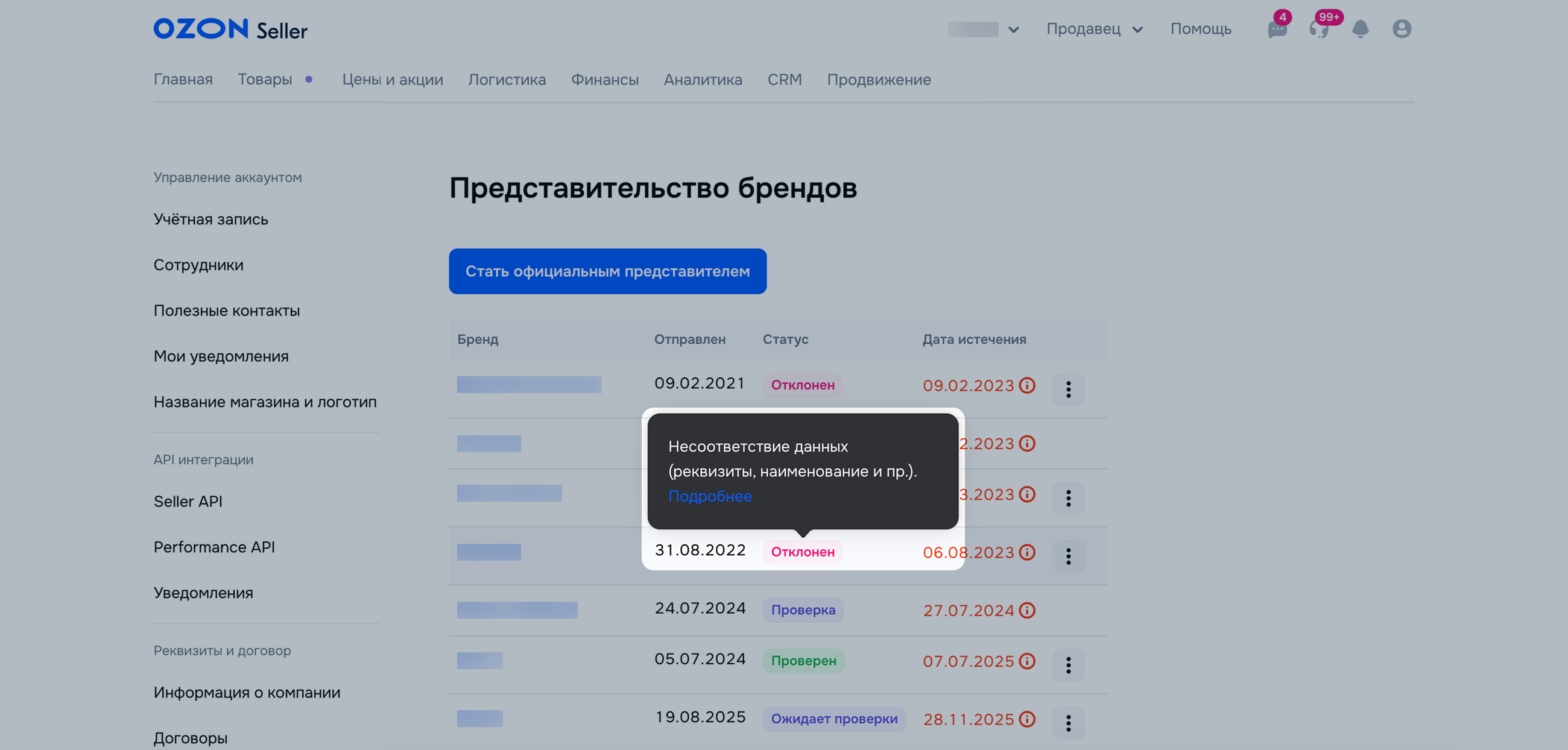 В разделе Настройки → Представительство брендов наведите курсор на запрос со статусом «Отклонен». Нажмите Подробнее или на название бренда. В поле «Комментарий модератора» вы увидите подробное объяснение, почему документы отклонили.