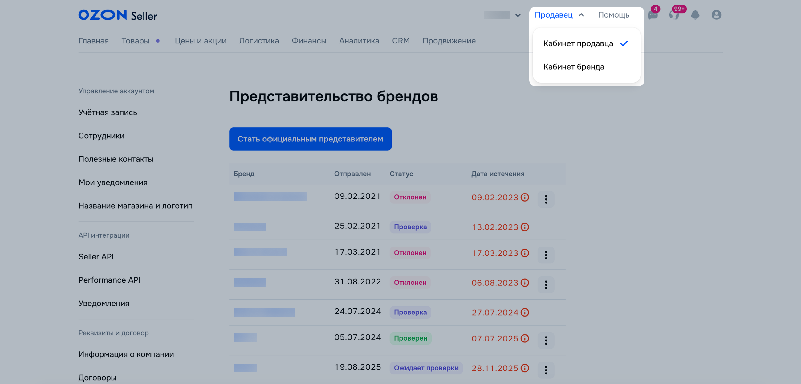Если вы совмещаете статус продавца товаров и представителя бренда, вы можете переключаться между кабинетами: