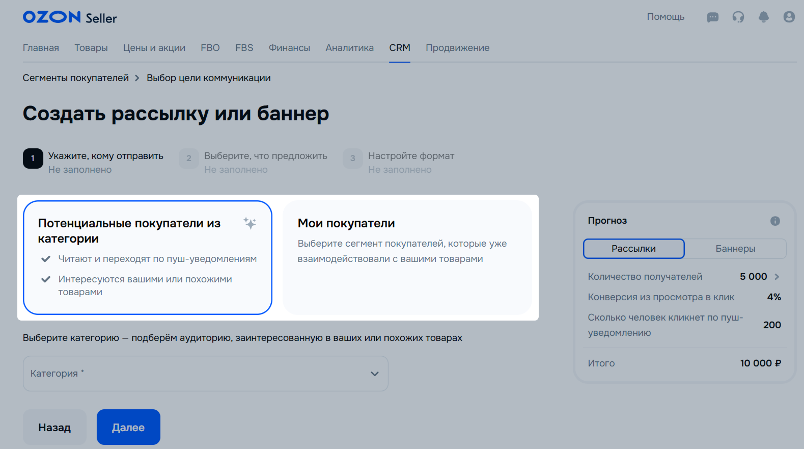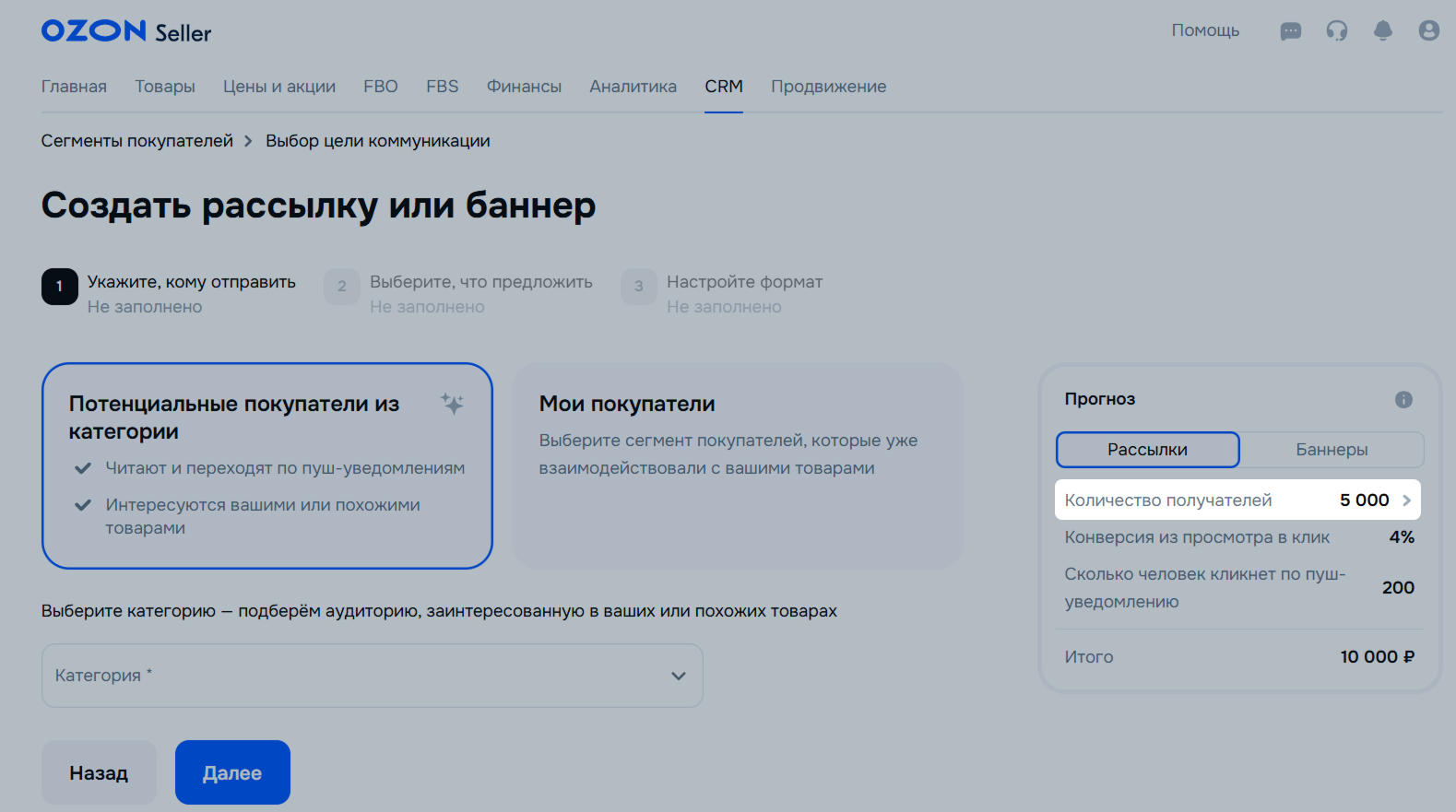 - Потенциальные покупатели из категории — система подберёт покупателей, интересующихся вашими товарами или похожими товарами в выбранной категории. На этих покупателей нельзя отправить рассылку с бонусами и запустить баннер.