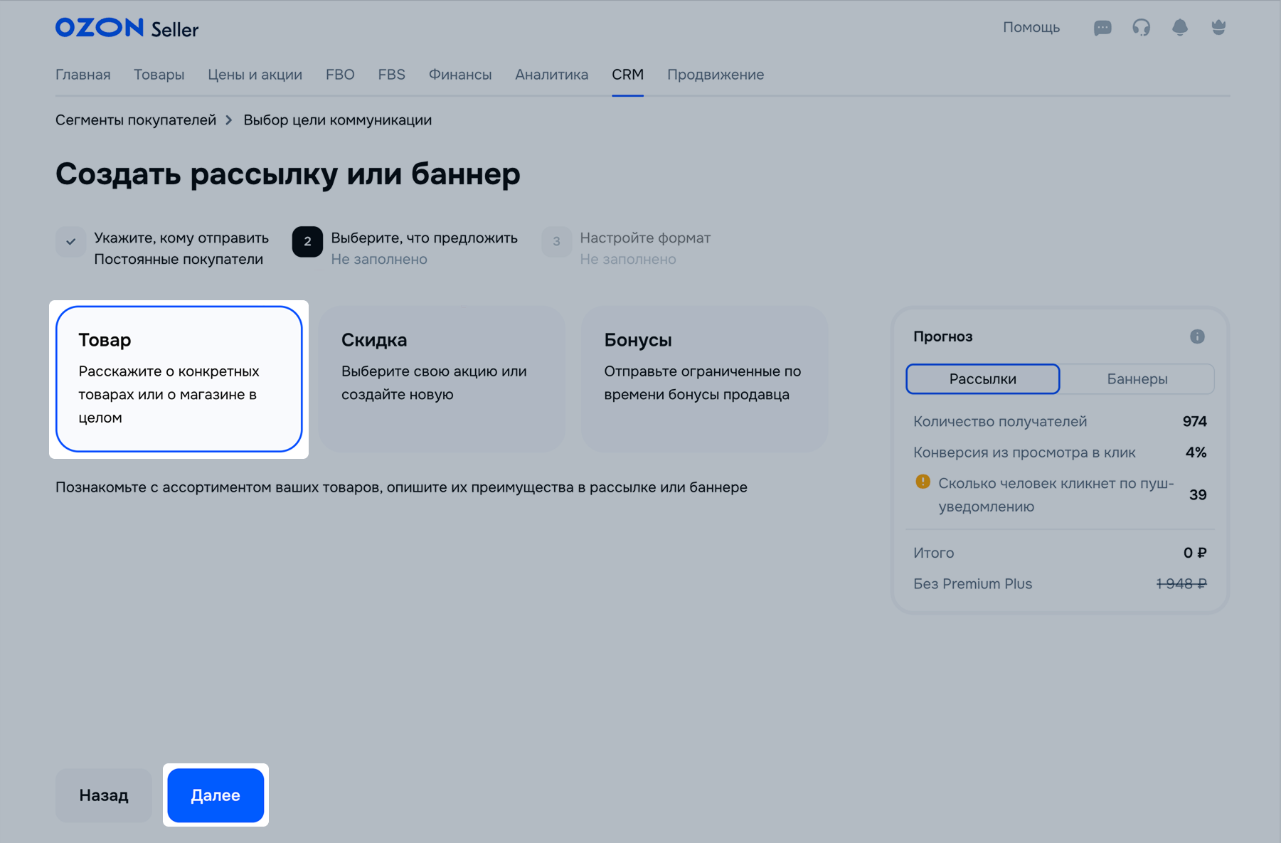 Выберите Скидки и одну из своих акций, которая действует на всех покупателей Ozon. Рассылку отправим только на сегмент покупателей, который выбрали на шаге 1.