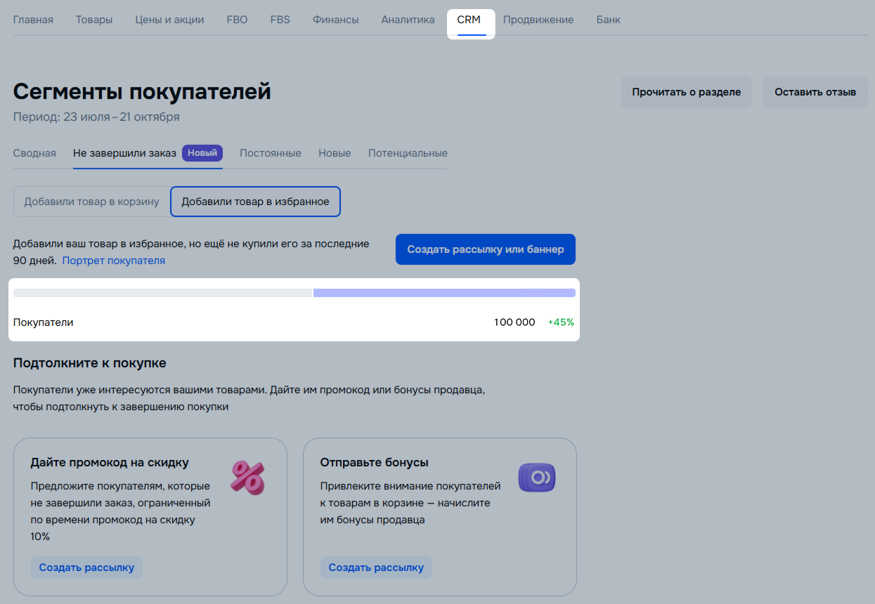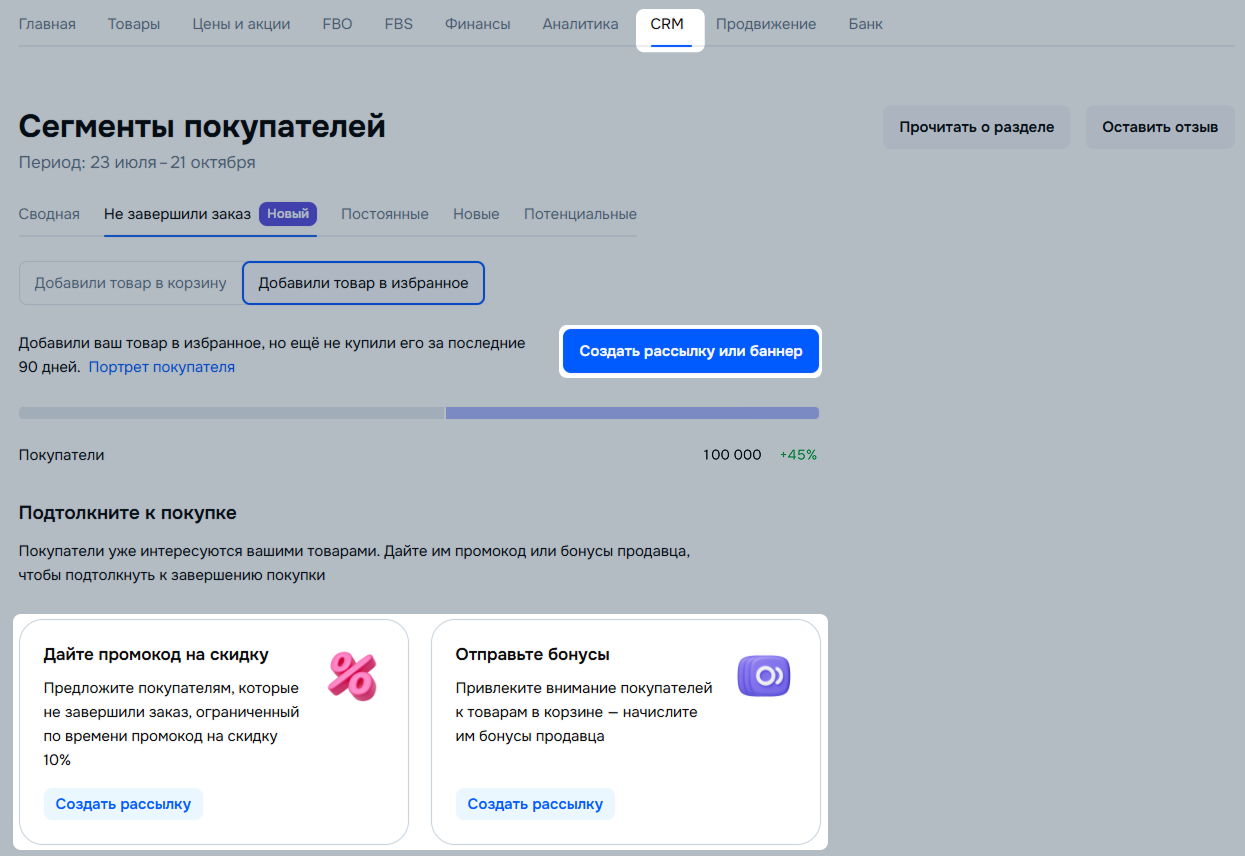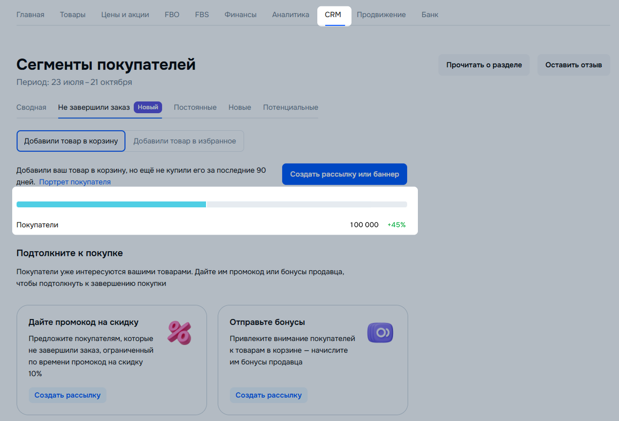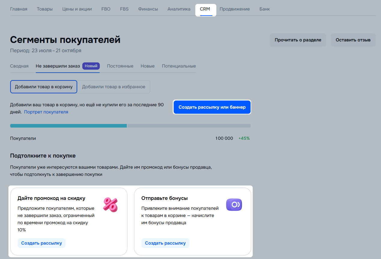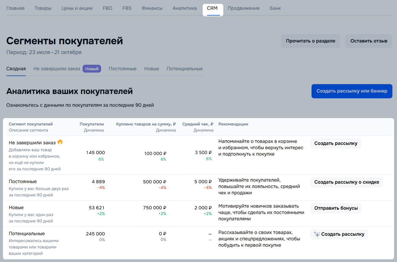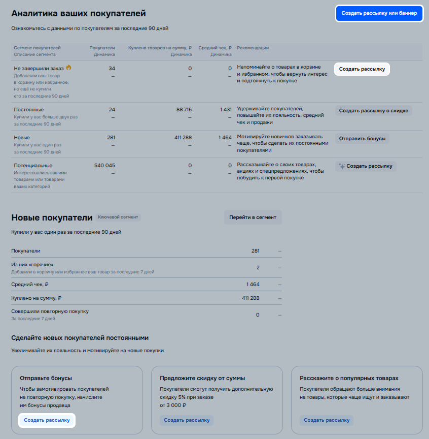 Возможно, у вас будет только один сегмент покупателей или ни одного. Например, вы только начали продавать на площадке и у вас пока мало заказов. Или старые покупатели не возвращались за новыми покупками в течение последних 90 дней. Работайте над удержанием покупателей: предлагайте скидки, бонусы, напоминайте о себе и мотивируйте на покупки. Так вы увеличите прибыль магазина и число лояльных покупателей.
