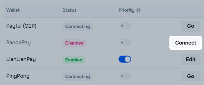 To connect the LianLian Pay method, go to the Settings → Contracts → Set up wallets section in your account. In the LianLian Pay row, click Connect.