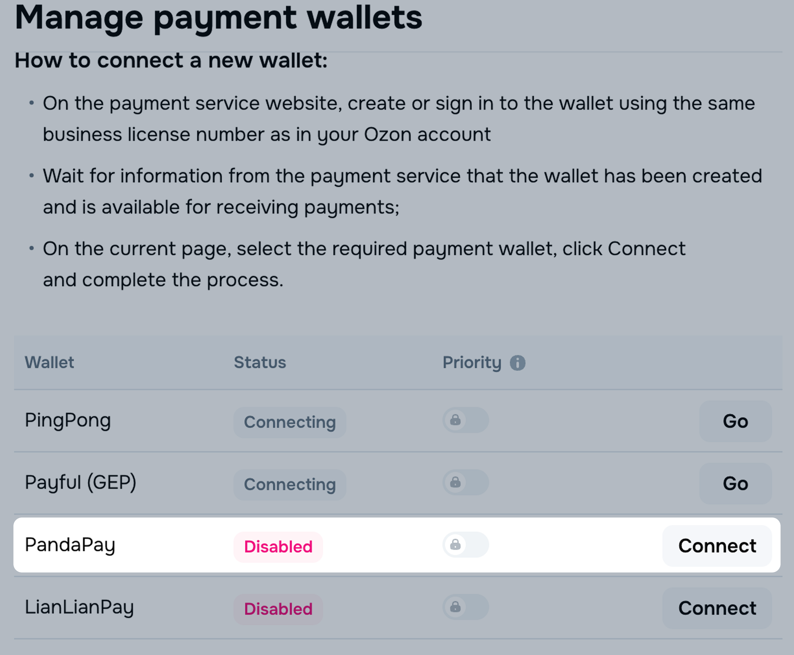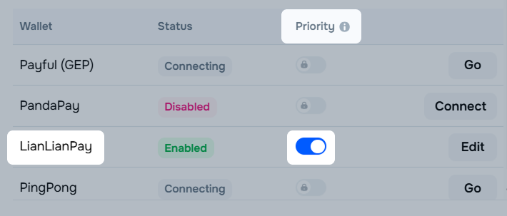 When connecting several payment systems, you can select the preferred one to receive payments to. There can only be one priority, but you can change it at any time.