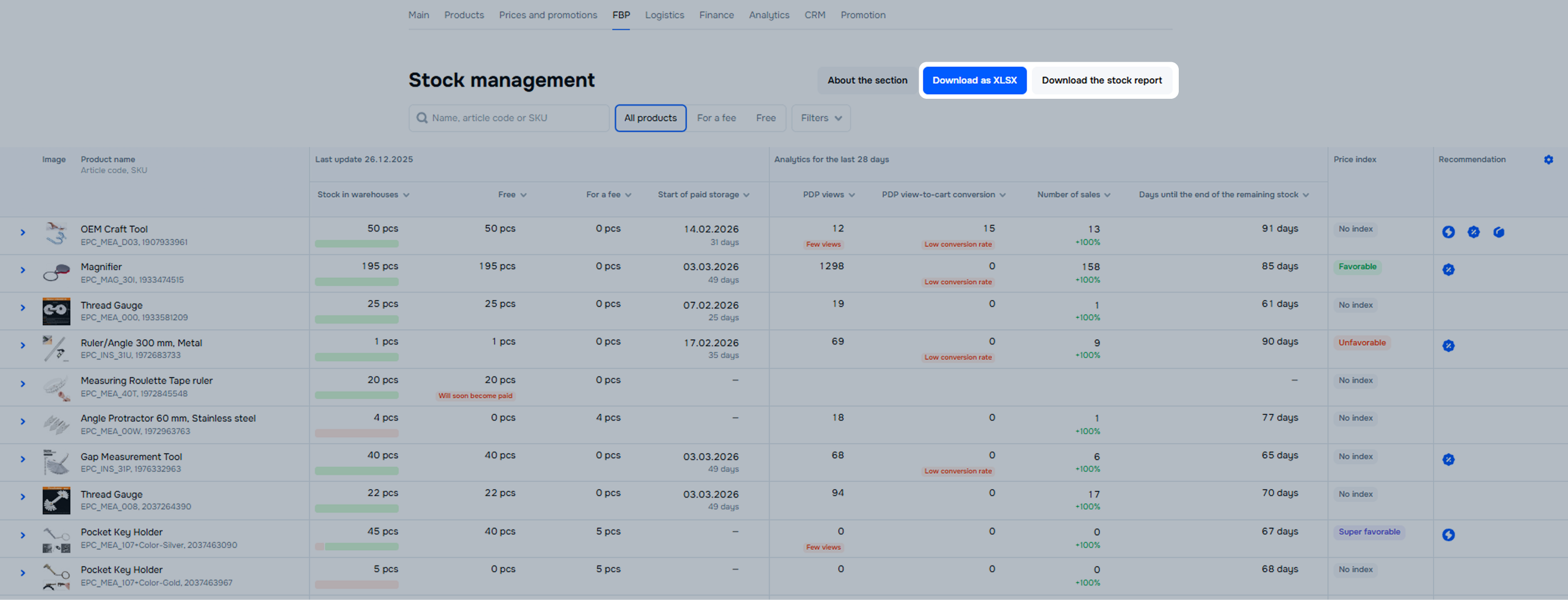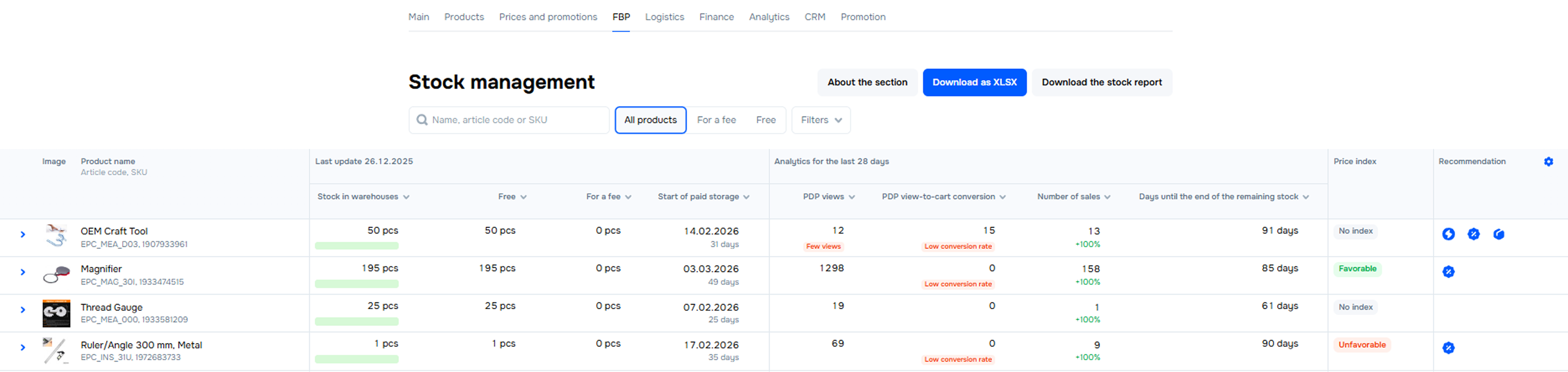 In FBP → Stock Management, you can view detailed information on all products in stock at FBP warehouses to make timely decisions about product removal, campaign launch, or promotion setup. This helps reduce storage costs and increase the stock liquidity.