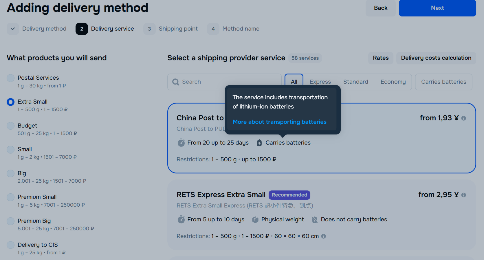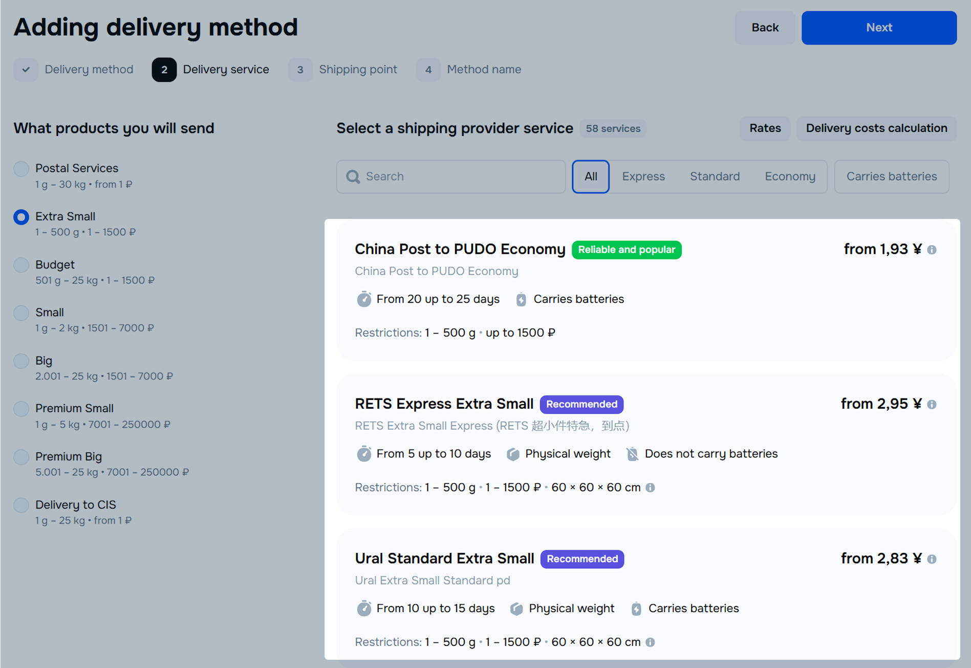 When you select a group, you see a list of available services. Postal services are marked as “Reliable and popular”. Methods recommended by Ozon are marked as “Recommended”: such methods score highly in our rating.