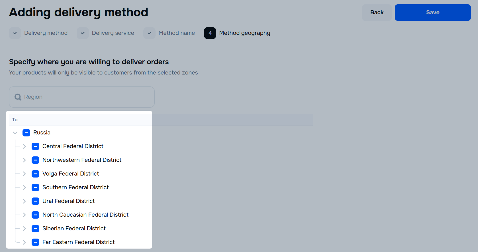 Set up the delivery geography. You can check the available regions and choose the ones you’ll deliver to.