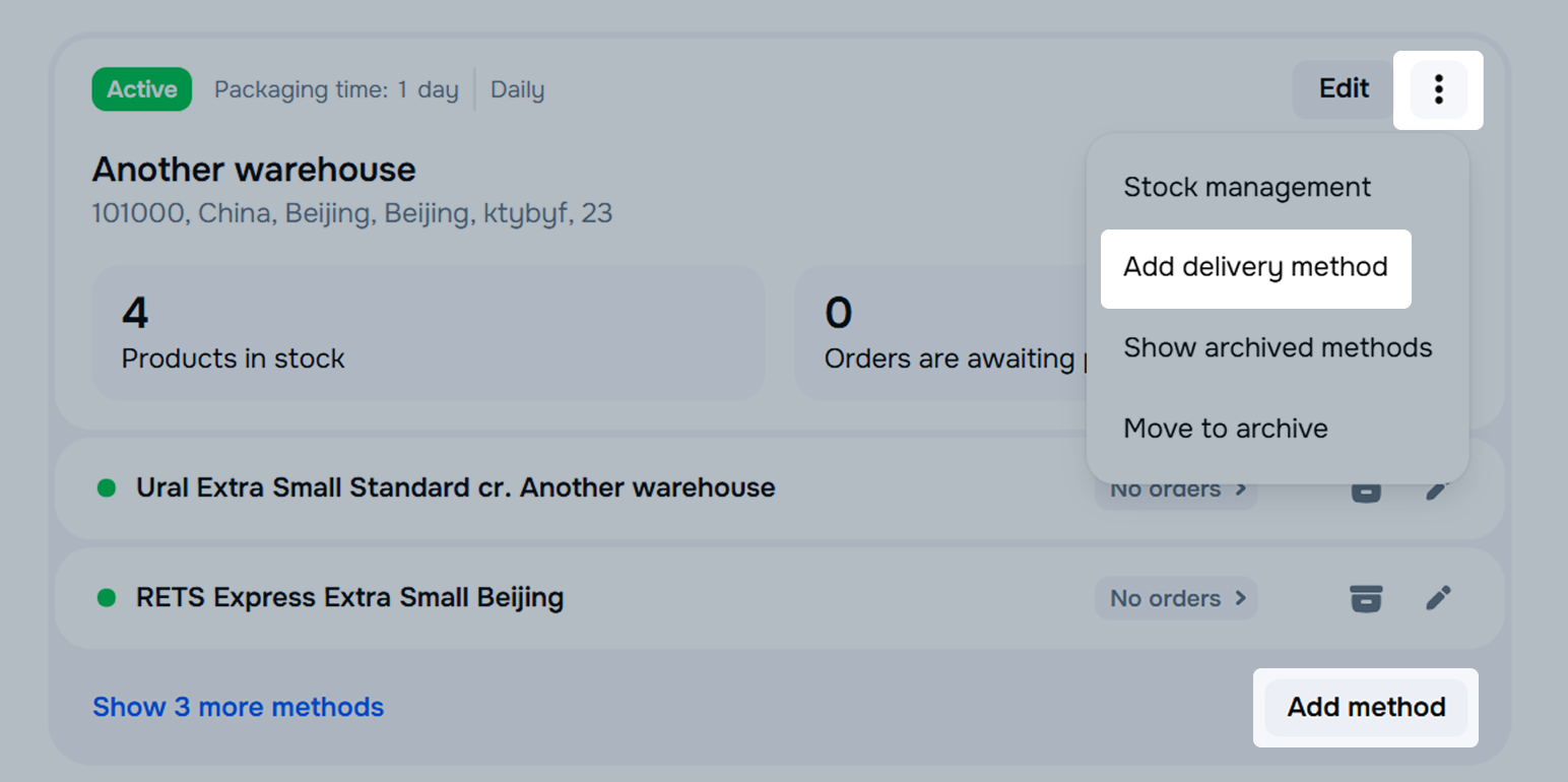 You can view or hide all methods that have been archived. To do this, in the Logistics → Logistics management section on the warehouse card, click